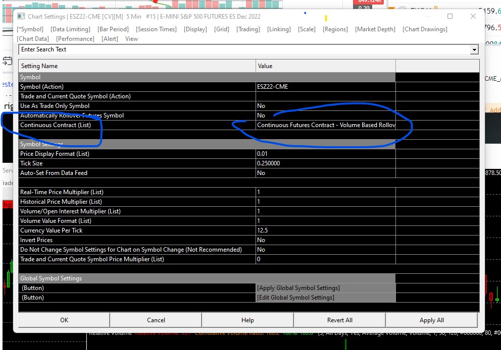 John, FYI just a little while ago someone in the SierraChart Discord room made a suggestion and it appears to have worked. The key is to make sure the Continuous Contract (list) input in Chart Settings, Symbols is set to "continuous futures contract - volume based rollover." That appears to have solved my chart issue after the roll to ESZ22. The attach chart function to this board is difficult to figure out. I thought I had followed your instructions from a week ago and really had no idea whether or not the chartbook you asked for was actually transmitted to you. Thank you for your help, but I believe the above solution worked. |