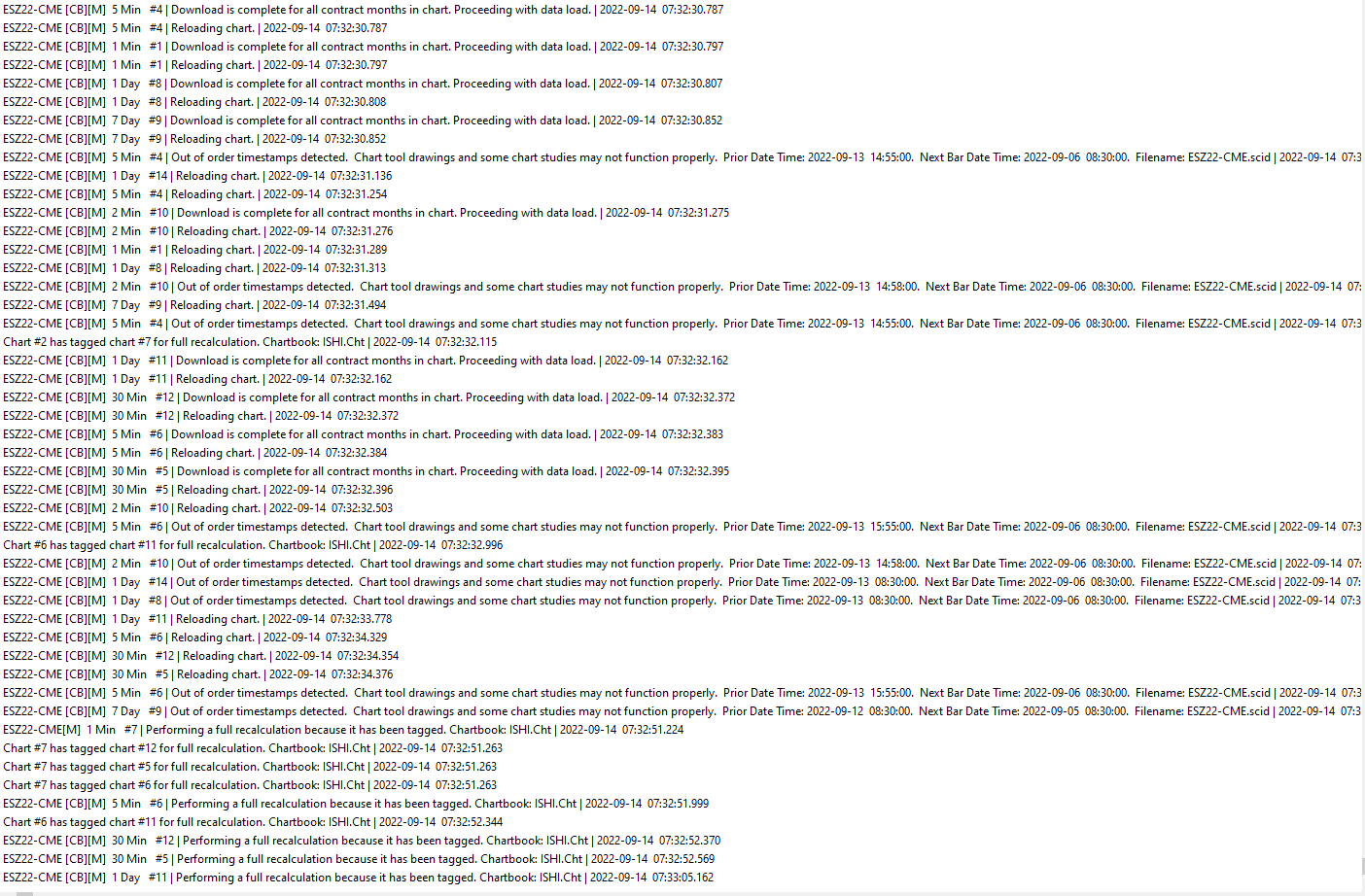 Hi Guys, Post rolling from ESU22 to ESZ22 this week my intraday historical chart which uses denali data feed is duplicating the prior daily bars at the end of the chart. I have tried to delete and redownload the data but it isn't working. Any advice on how to fix this? I have attached an image that shows what I am talking about. Many thanks, ballyo Date Time Of Last Edit: 2022-09-13 13:36:15