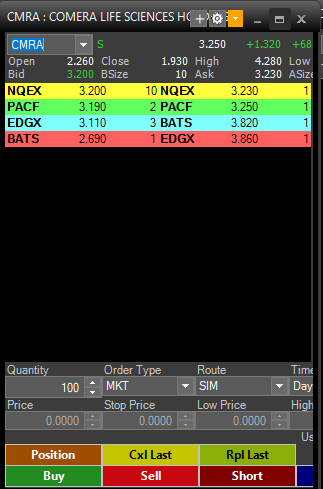 You need to use the NASDAQ TotalView data. So the symbol needs to be CMRA-NQTV. Refer to: Denali Exchange Data Feed: Nasdaq TotalView Data Feed Notes There is not a typical level 2 display but there is a market depth display. Sierra Chart Support - Engineering Level Your definitive source for support. Other responses are from users. Try to keep your questions brief and to the point. Be aware of support policy: https://www.sierrachart.com/index.php?l=PostingInformation.php#GeneralInformation For the most reliable, advanced, and zero cost futures order routing, use the Teton service: Sierra Chart Teton Futures Order Routing Date Time Of Last Edit: 2022-09-14 03:24:06