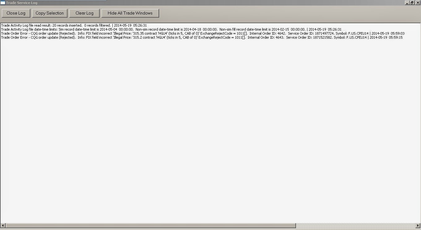 CQG is asking for the FIX log. Could you please do the following: Enable Global Settings >> Data/Trade Service Settings >> Enable FIX Logging. Restart Sierra Chart. Submit an order in this market that will cause an error and then provide us the FIX log according to the instructions here: https://www.sierrachart.com/index.php?l=doc/helpdetails79.html Sierra Chart Support - Engineering Level Your definitive source for support. Other responses are from users. Try to keep your questions brief and to the point. Be aware of support policy: https://www.sierrachart.com/index.php?l=PostingInformation.php#GeneralInformation For the most reliable, advanced, and zero cost futures order routing, *change* to the Teton service: Sierra Chart Teton Futures Order Routing |