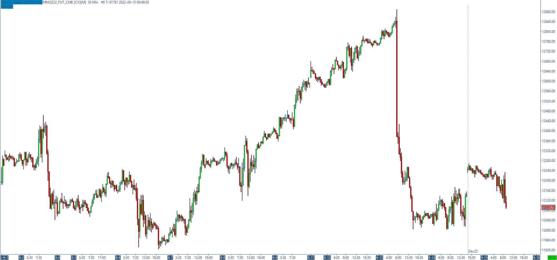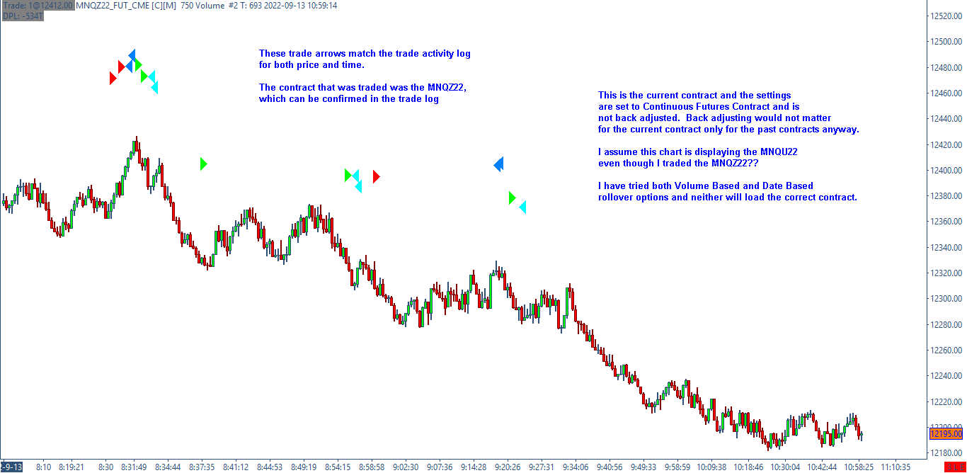 https://www.sierrachart.com/image.php?Image=1663218599216.png 1) I do not have back adjusted enabled. 2) I do not have automatic rollover enabled. 3) The chart is currently loaded with the MNQZ22 symbol which is what was traded on this day in question, which can be confirmed from the trade activity log. The trade arrows on the chart match the trade activity log. 4) I have performed the futures symbol rollover to the correct symbol that is displayed in the header. 5) I have deleted and downloaded the data multiple times. This chart MUST be showing the price activity for the MNQU22 - or - the data is incorrect for the MNQZ22. How can I force the charts to rollover correctly?????? The volume has rolled and the date is past, yet I cannot get it to display the correct contract. |
