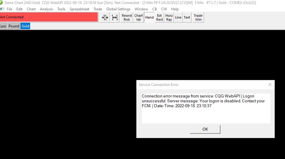Refer to 12 here: CQG Trading Platform Service: Common Error Messages You should have no trouble accessing the real-time data independent of CQG . Go through these instructions below. To access historical and streaming market data independent from your Trading service. Follow these instructions. Set "Global Settings >> Data/Trade Service Settings >> Current Selected Service" to "SC Data-All Services". Press "OK" And then translate the symbols in your Chartbooks and Sierra Chart using this "Edit' menu command: Edit Menu: Edit >> Translate Symbols To Current Service (Translate Symbols to Current Service) You can then use the data provided by Sierra Chart independent of your trading service. Sierra Chart Support - Engineering Level Your definitive source for support. Other responses are from users. Try to keep your questions brief and to the point. Be aware of support policy: https://www.sierrachart.com/index.php?l=PostingInformation.php#GeneralInformation For the most reliable, advanced, and zero cost futures order routing, use the Teton service: Sierra Chart Teton Futures Order Routing Date Time Of Last Edit: 2022-09-19 11:23:49