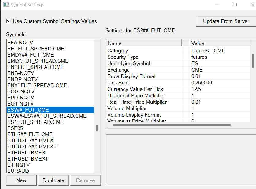 Can you confirm that this is the SYMBOL_DATA_DISPLAY_PRICE_MULTIPLIER value of sc.GetSymbolDataValue() Yes. In most cases In Sierra Chart v2443, SYMBOL_DATA_DISPLAY_PRICE_MULTIPLIER returns a value of 1.0 for ES?##_FUT_CME I believe it should be returning a value of 0.01 as per attached screenshot of the symbol details? |