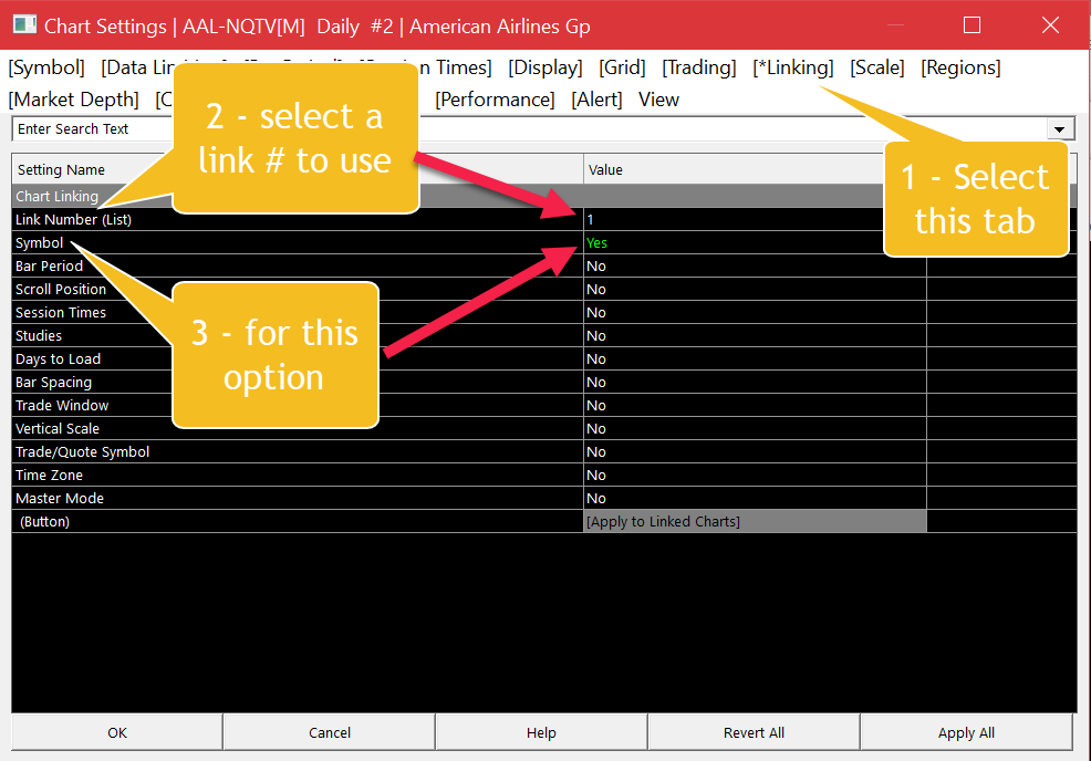 The ability to link charts is under the Chart menu. You need to do this for each chart you want to link. 1 - Open the Chart menu 2 - Select the Link tab at the top 3 - Select the link # you want to use - It should be the same for each chart 4 - Select what you want to use as the "thing or things" that can cause a change to occur in all of the linked charts Below is the URL that describes this capability in the docs Chart Menu: Linking (Chart menu) Hope this helps, JohnR |