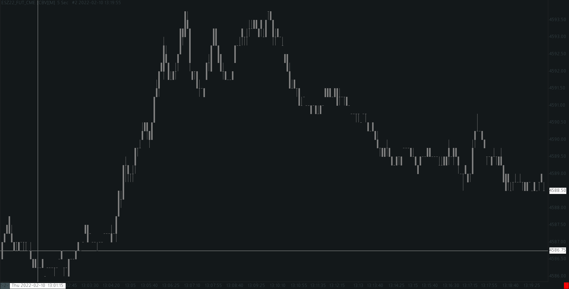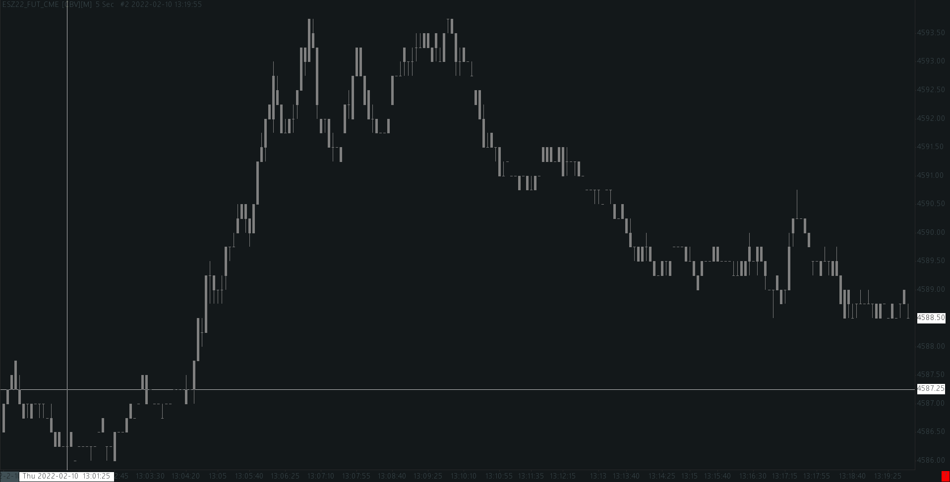 I have been looking back at some low timeframe intraday data from 2022-02-10 for ES on a backadjusted continuous volume based rollover chart setting. When I look at a 5 second chart, I can see small gaps where bars are missing, e.g. from 13:02:15 to 13:02:25 UTC the 13:02:20 candle is missing. Here is 13:02:15 highlighted, then in the next image showing the immediate next candle to be 13:02:25 rather than 13:02:20 as expected: https://www.sierrachart.com/image.php?Image=1664193785770.png https://www.sierrachart.com/image.php?Image=1664193819714.png This isn't the only spot where I've found these small gaps, is there anything that can be done about this? Thanks. |