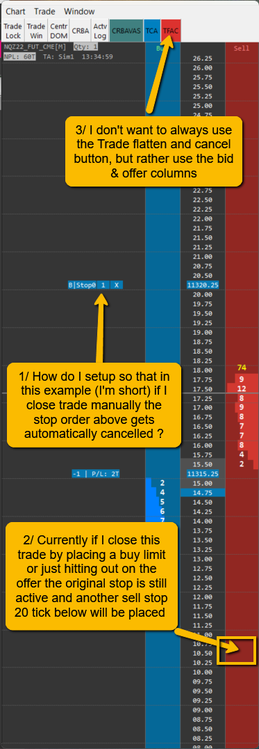 When scalping the DOM I want quick in and out not messing around moving OCO or attached orders, but rather doing it all manually just using the bid & offer columns. Currently I do not use any attached orders, but I would prefer to enter trade with an emergency stop in place and have this automatically cancel when position is flat. I don’t want to use the Trade flatten and cancel button to close trades because I’m trying to pick my price on the DOM. Also if I attach a stop to my trade then when I go to close out the trade using either the bid or ask column, another stop is placed and I’m left with 2 active stops one above and one below price. I’ve attached an image to help explain what I mean, but I don't think what I'm asking for is possible, thanks |