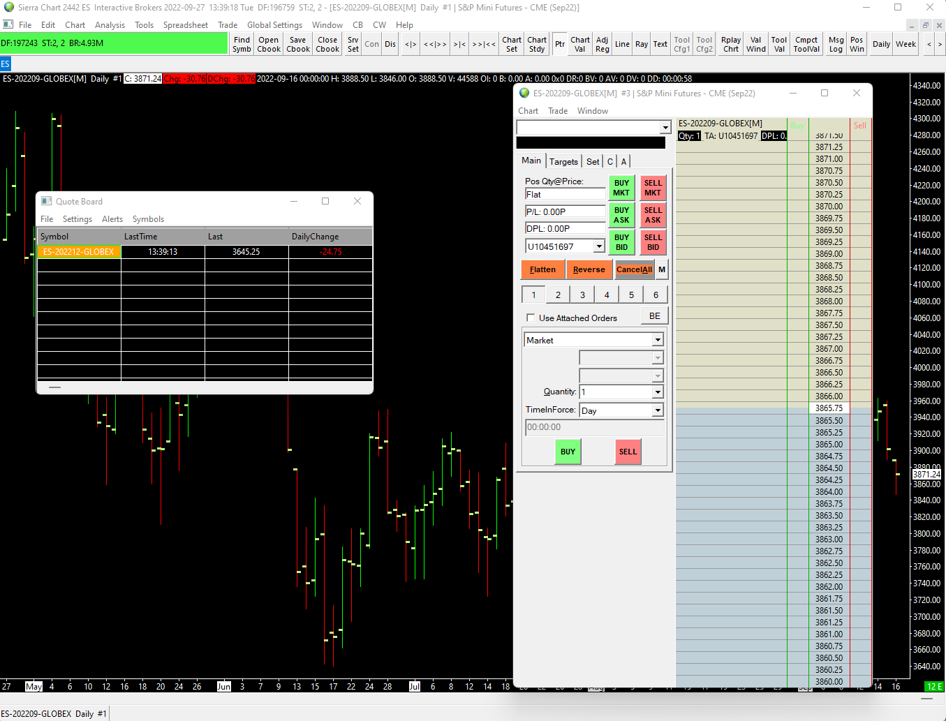 You have two different symbols in the image. The Quote Board is ES-202212-GLOBEX where as the DOM is ES-202209-GLOBEX. The September contract is no longer trading, you need to change it to the December (202212) contract.