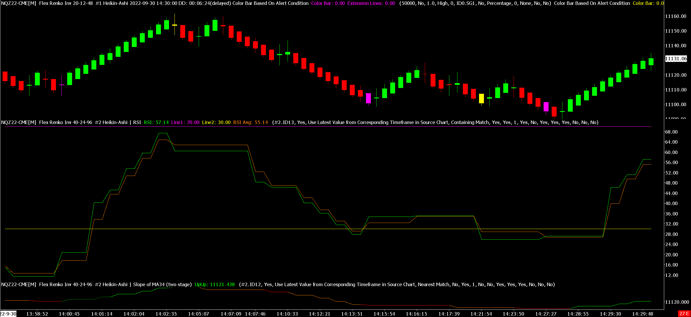 It is working fine for us. The image at the following link is what we see: https://www.sierrachart.com/image.php?Image=1664574315404.png You can see two yellow bars, one at 14:02:36 and the other at 14:21:54. These correspond to when the RSI crosses the RSI Average from above, as per your Color Bar Based on Alert Condition. For the most reliable, advanced, and zero cost futures order routing, use the Teton service: Sierra Chart Teton Futures Order Routing |