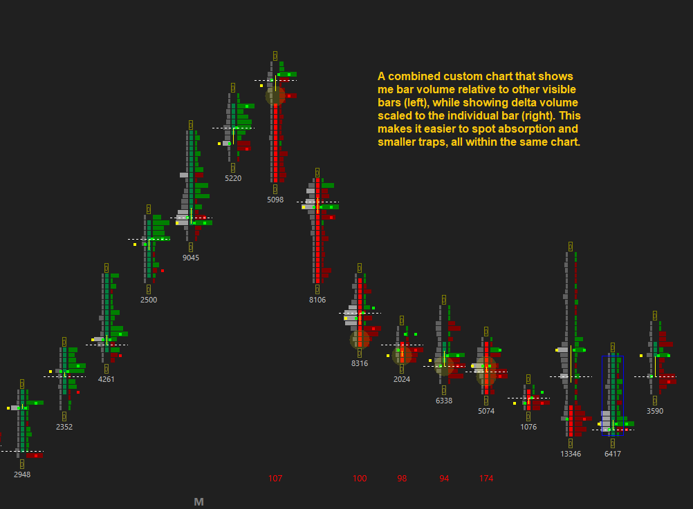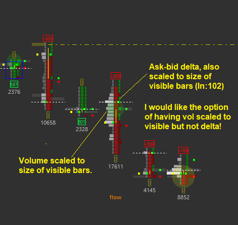 Dear Support: I am attaching an example created using the [numbers bar] study. To the left of the body is (ask+bid) volume, aka total volume per tick. To the right of the body is (ask-bid) delta. My request involves adding granularity to In:102 [view profile bars length relative to all visible bars]. Unfortunately, setting this to YES forces both volume and delta to scale relative to all visible bars. Can you please create the choice of profiling only the left side, only the right side, or both sides? Ideally, I would like to have volume displayed relative to all visible bars, but have delta not display relative to all visible bars. This would have the effect of accentuating delta while still displaying proportionate volume. Such settings make it easy to spot absorption/support/resistance (from the volume side) as well as trapped traders (from the delta side). Right now, the single toggle (yes/no) of In:102 forces a compromise between one or the other. Regards, @LewPayne Date Time Of Last Edit: 2022-10-03 05:11:10