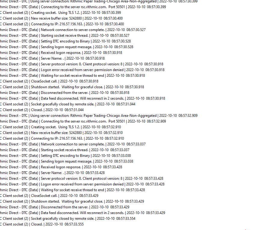 This is what we see: Rithmic Direct - DTC (Data) | Logon error received from server: permission denied | 2022-10-10 09:33:19.872 Refer to: Rithmic Trading Platform Service: Permission Denied Resolution Procedure Sierra Chart Support - Engineering Level Your definitive source for support. Other responses are from users. Try to keep your questions brief and to the point. Be aware of support policy: https://www.sierrachart.com/index.php?l=PostingInformation.php#GeneralInformation For the most reliable, advanced, and zero cost futures order routing, use the Teton service: Sierra Chart Teton Futures Order Routing |
