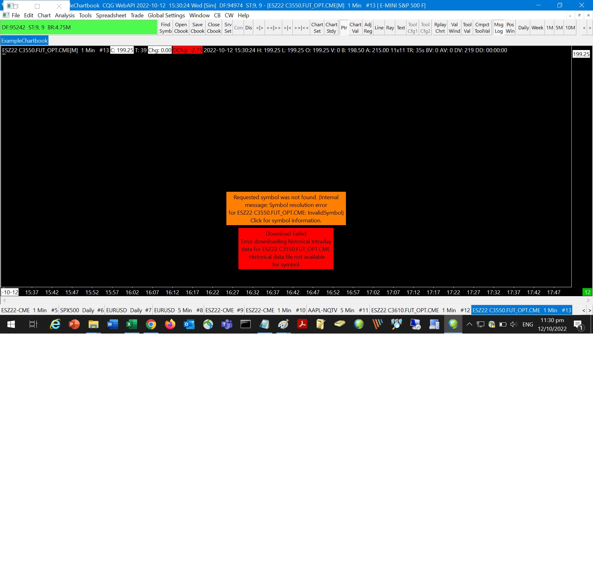 The error in yellow is expected to be seen with CQG. Disregard it. The error in red indicates there is no data for that option contract. No: In addition, is there a way we can see number of strikes of options for a month? Sierra Chart Support - Engineering Level Your definitive source for support. Other responses are from users. Try to keep your questions brief and to the point. Be aware of support policy: https://www.sierrachart.com/index.php?l=PostingInformation.php#GeneralInformation For the most reliable, advanced, and zero cost futures order routing, use the Teton service: Sierra Chart Teton Futures Order Routing |