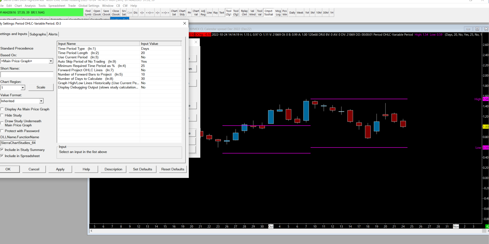I am trying to have a line drawn for high and low of past 20 trading days. Using Period OHLC-Variable Period Study. For some its drawing 2 sets of lines instead of 1. Looks like only drawing over 10 day and not 20 days.