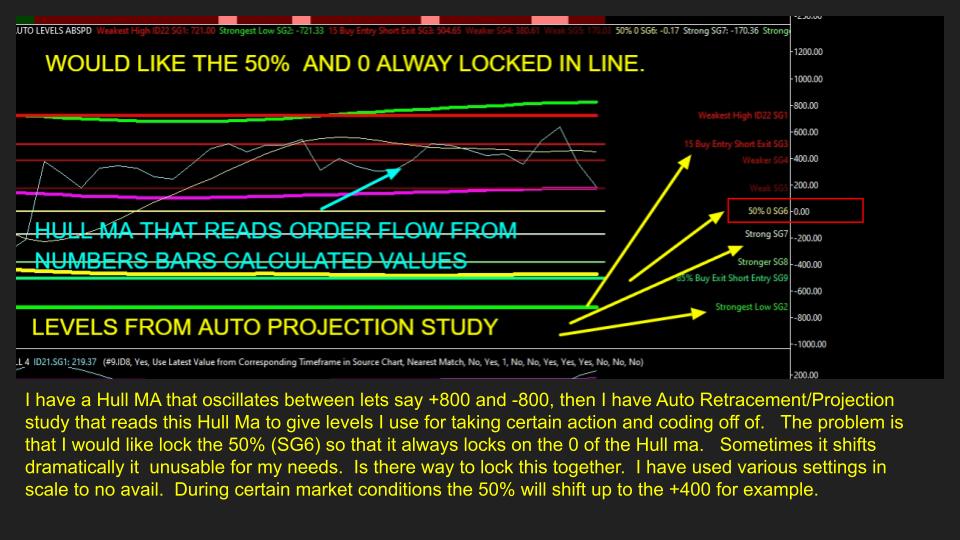 I have a Hull MA that oscillates between lets say +800 and -800, then I have Auto Retracement/Projection study that reads this Hull Ma to give levels I use for taking certain action and coding off of. The problem is that I would like lock the 50% (SG6) so that it always locks on the 0 of the Hull ma. Sometimes it shifts dramatically it unusable for my needs. Is there way to lock this together. I have used various settings in scale to no avail. During certain market conditions the 50% will shift up to the +400 for example.