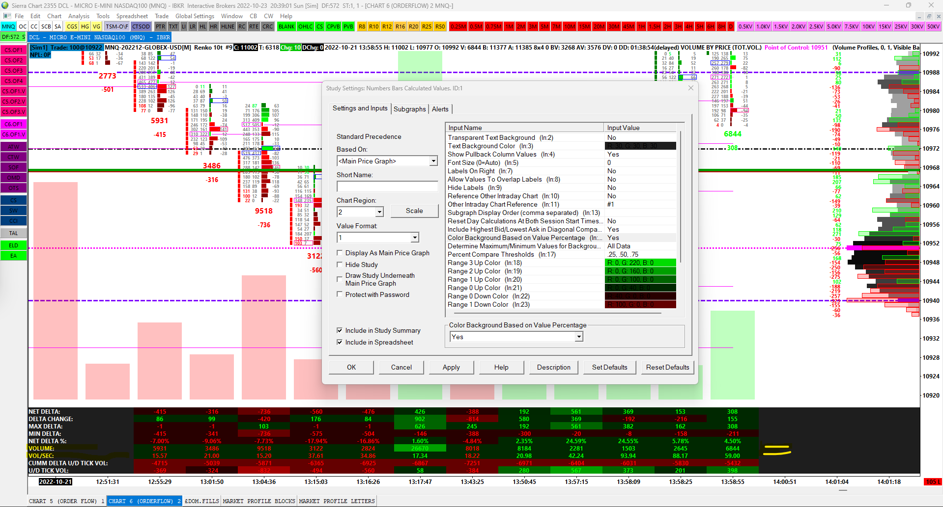 I've been unable to figure out how to make the positive values of VOLUME and the positive value of VOL/SEC on the Number Bars Calculated Values - it only highlights the background in green instead of red in response to close of red candle bars. Do you have such function on this? See attached file.