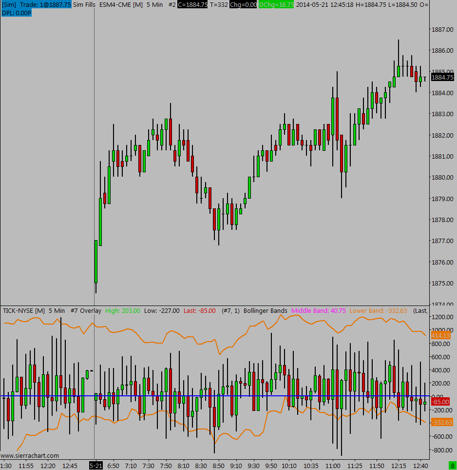 The Bollinger Band calculation looks reasonable to us. Why do you think it is incorrect? We assume you have set the Based On setting with that study to the TICK-NYSE overlay study? Sierra Chart Support - Engineering Level Your definitive source for support. Other responses are from users. Try to keep your questions brief and to the point. Be aware of support policy: https://www.sierrachart.com/index.php?l=PostingInformation.php#GeneralInformation For the most reliable, advanced, and zero cost futures order routing, *change* to the Teton service: Sierra Chart Teton Futures Order Routing Date Time Of Last Edit: 2014-05-21 19:52:34