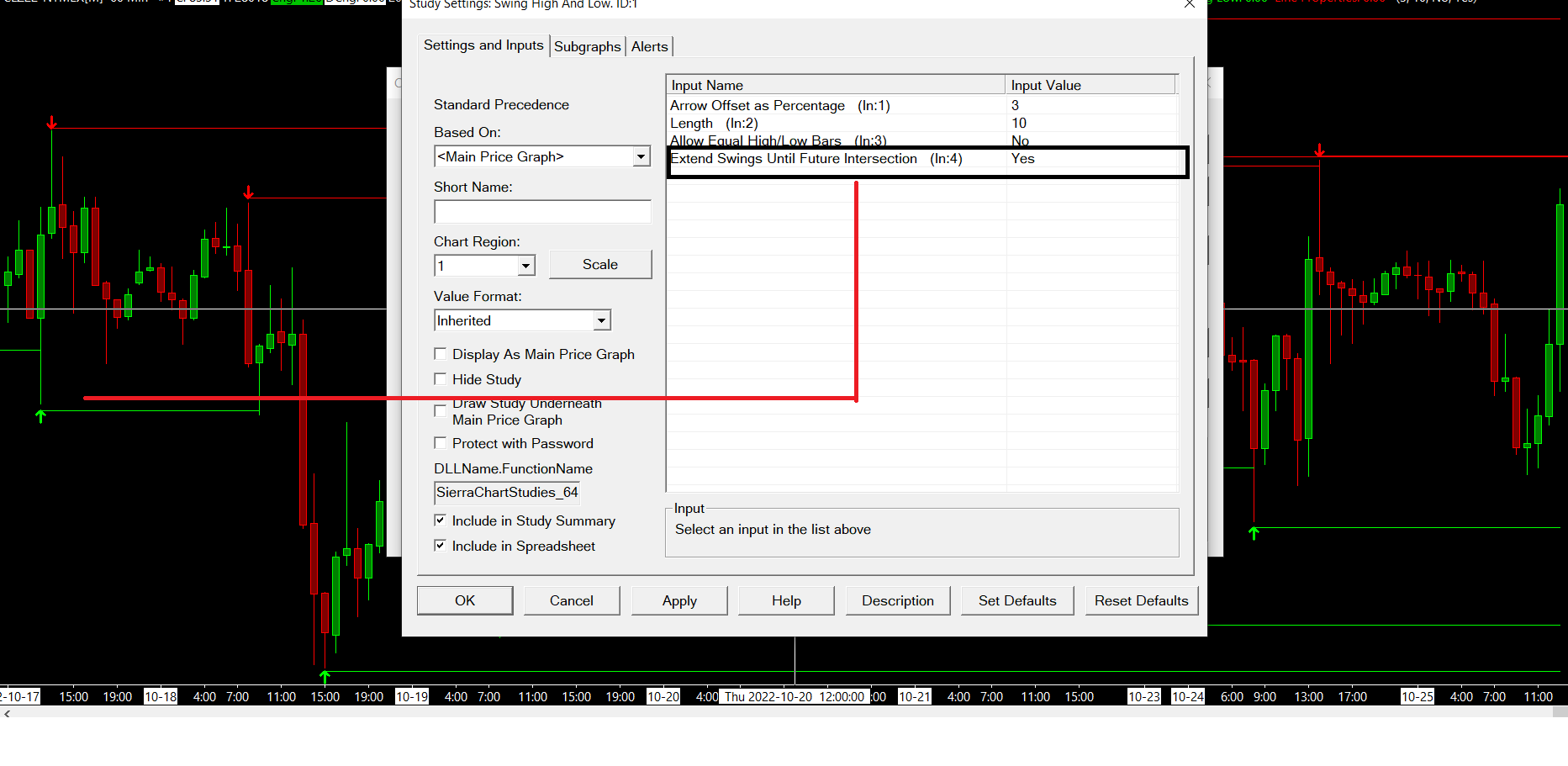Background: I got to know about Swing High and Low, This study has an input "Extend Swings until further intersection", I mostly work around using spreadsheets for alerts and trading, however, I could not find a way to export these lines to a spreadsheet, Query: Kindly help me export these lines ( Roughly S/R lines ) or an alternative to this, which would help me create an alert around these lines, price touching the line etc. or exporting these lines into the spreadsheet, I am attaching the images to give reference about the lines and input I am talking about and the spreadsheet column (Line Properties ) What I have tried so far: Tried changing the drawing type of Line Properties subgraph (which was default - Subgraph Name) to Line, dash, etc ; yet no change in spreadsheet column Any help would be appreciated |