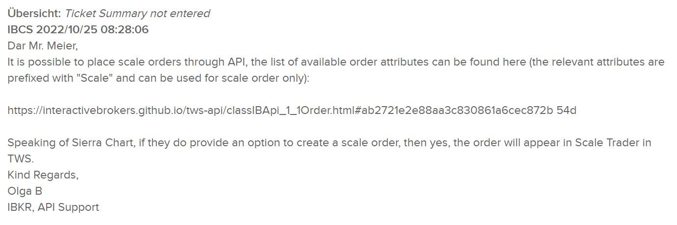 Hi, i would like to send scale orders to IBKR. I have already spoken to IBKR, they said it is possible to send scale orders by API ( look at attached Photo, IBKR TIcket ). I have some experience with C++, so i would try this. Perhaps you have a example about a existing simply Limit order for the IBKR API? This would help me a lot. If you say this might be possible to implement i would study this problem. But if you have already tried it and its impossible, please give me a short explanation of the problem. Thanks Tom |