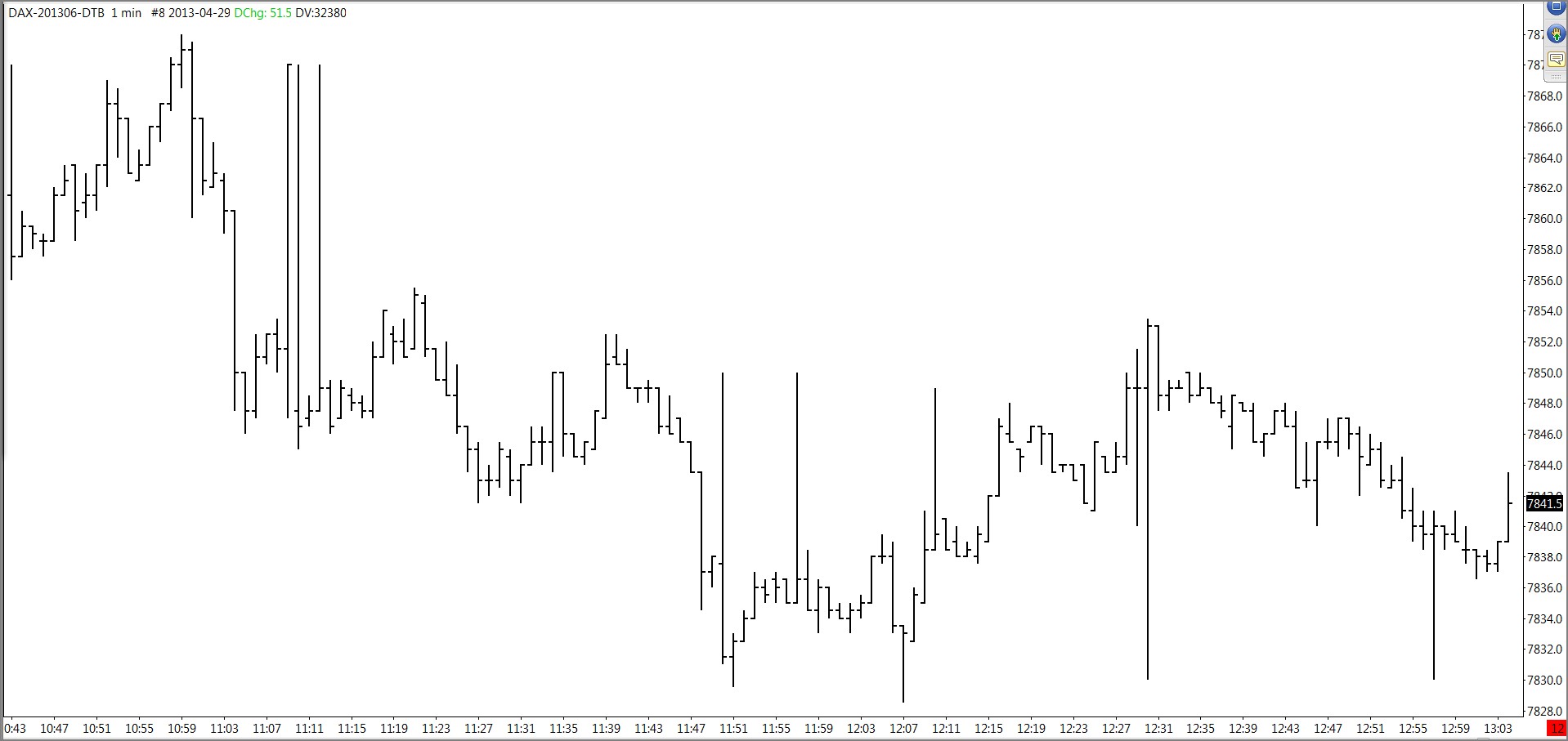 Since yesterday I am experiencing big spikes in DAX Future charts with IB data (see attached chart). Anyone else has this problem ? Any reasons ? Also this morning still happening. |