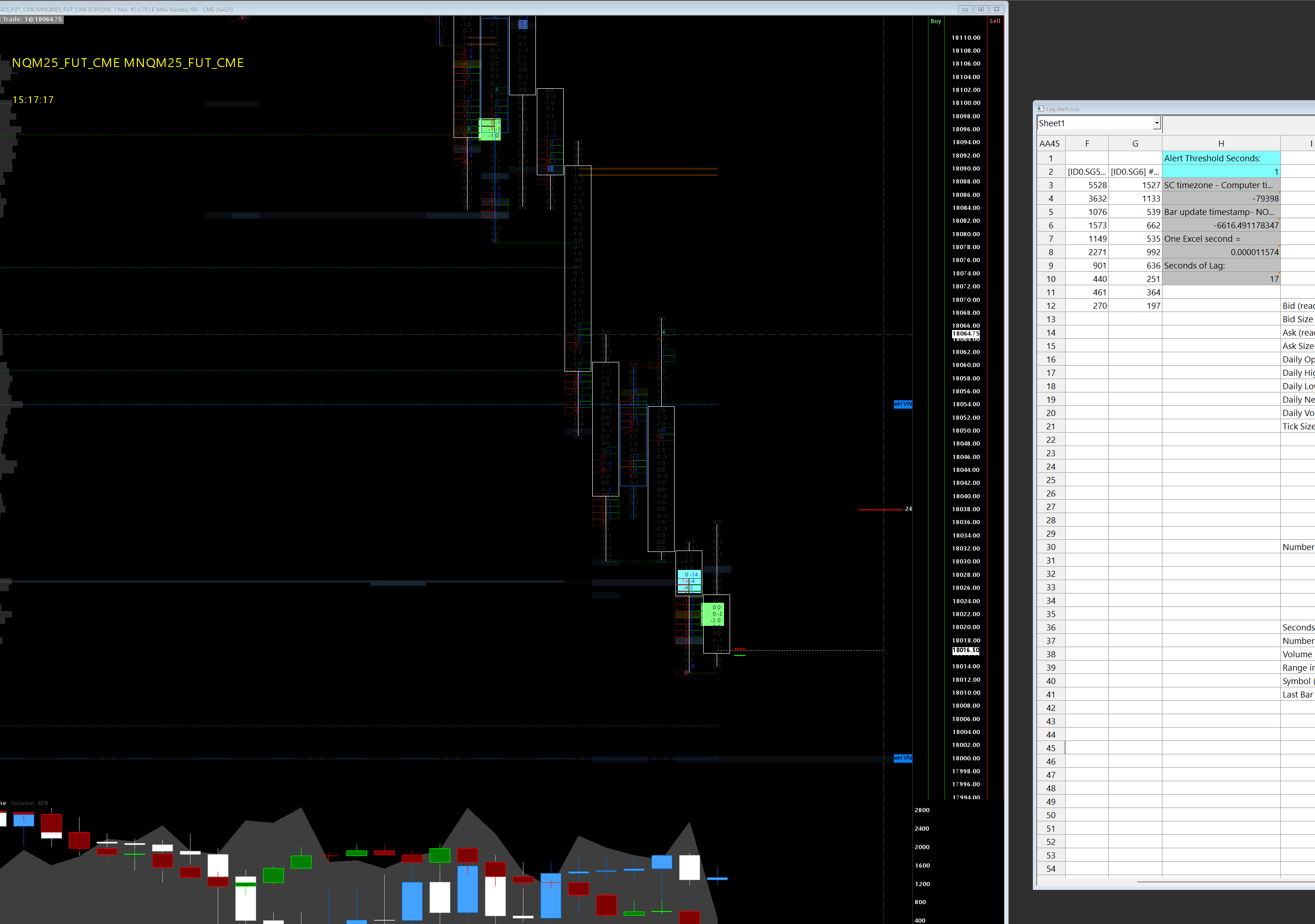 It should, because it compares NOW() to the 'Last Bar End DateTime' (J41), which has no correlation to bar period.It works for me. The Data Delay in the chart header shows the exact same lag as the spreadsheet study in post #12. The advantage with the spreadsheet study is you can set an alert threshold, and you could display the lag in seconds larger, using the Text Display for Study study. The spreadsheet study could also color the chart background when the lag exceeds the threshold, making the alert very visible. |