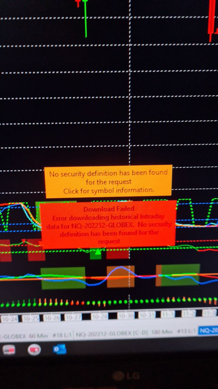 Dear All, at 7 november my charts of the MNQ (MINI NASDAQ) worked ok. Since today I can't download any chart data. I get a message in a red screen: " Download failed. Error downloading historical intraday data for NQ-202212-Globex. No security definition has been found for the request " can you please help me out ? Gerard |