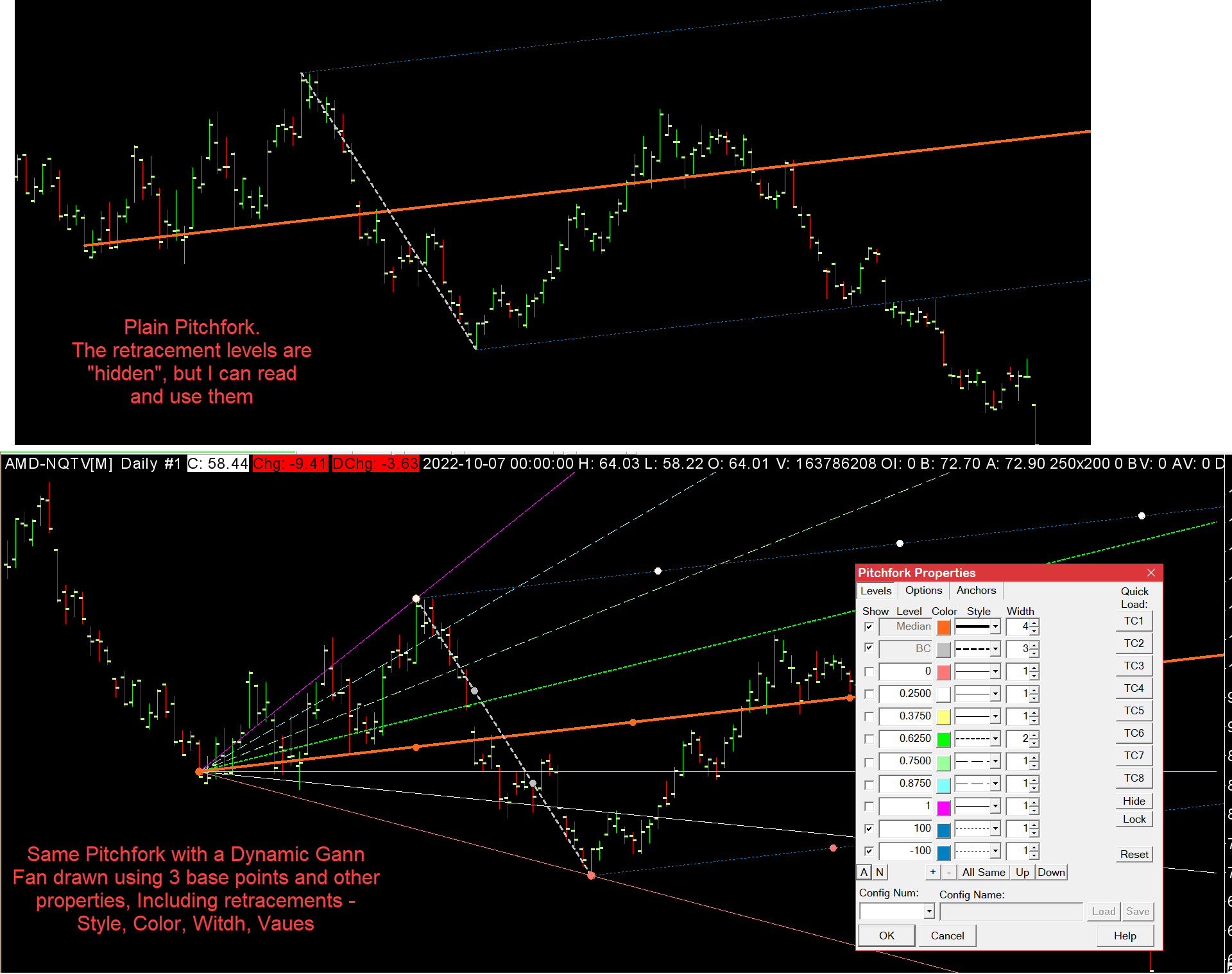I have created an "Add-On" tool. I created my drawing this way as I am able to use all of the existing functionality , options, menus option windows already within SC. So what I did was establish a MenuEventID item is the entry point into my code. Within the code 1 - it first deletes all of the lines (retracements) it has drawn on this chart, 2 - then it searches for PitchForks. 3 - When it finds one, it uses the 3 base points, other properties as well as reads all 32 possible retracement levels for - Line style, width, color and retracement value. Then I draw my Dynamic Gann Lines (fan) using the info just read plus some calculations. All of this works, I am even able to realize when a drawing object has been "cut" in length to vary length of my fans to match. My issue is that I use multi time frames and I share drawing from a higher level down to a faster one. The user drawn pitchfork is shared and is seen and can be manipulated via the user so all good so far.... but .... the existing calls doo not allow me to read these objects. _ Shared Drawings If I can't find and read the Shared Pitchforks, then I can not create my "Add-On" Dynamic Gann Fan. I am looking for a function similar to ones for ACSIL drawn and user drawn but will work with SharedChartDrawings. --> sc.GetUserDrawnChartDrawing(sc.ChartNumber, DRAWING_PITCHFORK, JOR_DrawingObj, JOR_DrawingIndex) new API -> sc.GetSharedChartDrawings(......); I would think it is an easy / quick API to create. Probably just point the function to a different array / same structure as ACSIL and UserDrawn functions. All other 'stuff' -- logic / structures / etc should be the same. It would be greatly appreciated if this is possible in the near future. SC support - If you are interested in using my code to integrate into a native tool, It is well documented. JohnR Date Time Of Last Edit: 2022-11-16 23:31:20