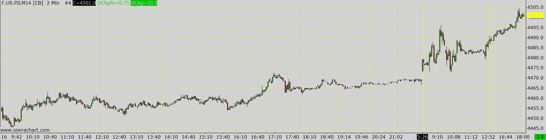 Hi, I'm trying to change feed, from TT to CQG to trade FCE and I have some issues : 1) I can't place orders. There are rejected : Trade Activity Log file read result: 1887 records inserted. 0 records filtered. | 2014-05-26 11:59:39 Trade Activity Log file date-time limits: Sim record date-time limit is 2014-05-21 00:00:00. Non-sim record date-time limit is 2014-05-06 00:00:00. Non-sim fill record date-time limit is 2014-03-27 00:00:00. | 2014-05-26 11:59:39 Trade Order Error - CQG order update (Rejected). Info: Cannot route the order at this time. Internal Order ID: 30208. Service Order ID: 422380431. Symbol: F.US.PILM14 | 2014-05-26 17:11:33 2) Time and Sales window displays false time in "Time" column. In the file attached on the left there is OEC T&S and on the right there is CQG T&S. With CQG feed, time assigned to new orders in "Time" column is often equal to : next time order + 0.001. Example 18:01:09.050 then 051 then 052 then 053 then 054……..073. 3)Probably because of the issue 2), time scale of intraday chart is false (see file attached below) http://www.sierrachart.com/image.php?l=1401122448330.png |