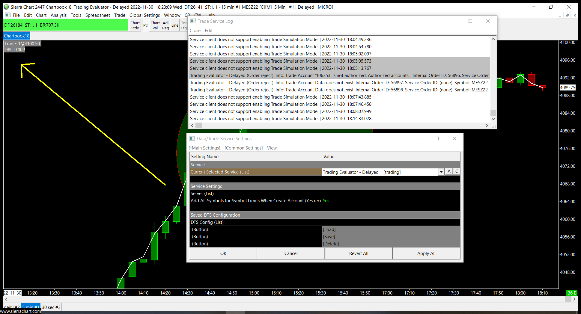 John... I set my account to package 3 as you recommended and I set the data to Trader Evaluator. Now my charts are stuck on live and I cant choose the simulator . I included a picture of my log and my data trade service setting window. Thanks. https://www.sierrachart.com/image.php?Image=1669854190315.png |