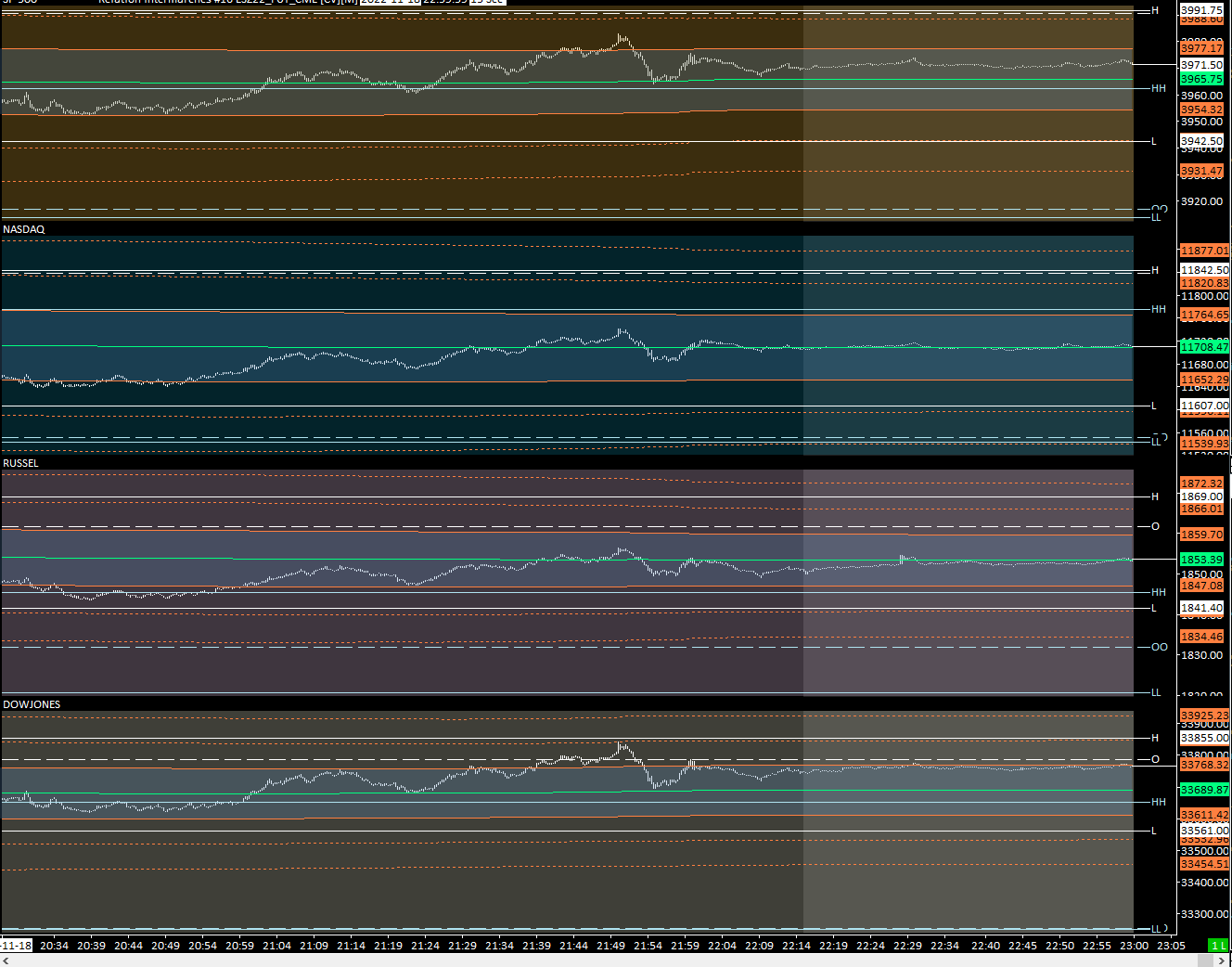 Hello, Thank you for the feedback. I managed to get what I wanted on region 1 where all the studies in the "chart studies" are in the "same as region" and "automatic" on the chart scale. On the other hand, for region 2, 3 and 4 nothing is displayed. For all these regions I use "study/price overlay" to display price bars, highlight and VWAP from another first chart and for day and past day OHLC two "study/price overlay" from a second chart. This for each Symbol. These two graphs are displayed correctly and are in "same as region" for all studies and "automatic" for the main scale. I don't understand why it doesn't work, can you enlighten me? I have attached a screenshot. Thanks a lot. |