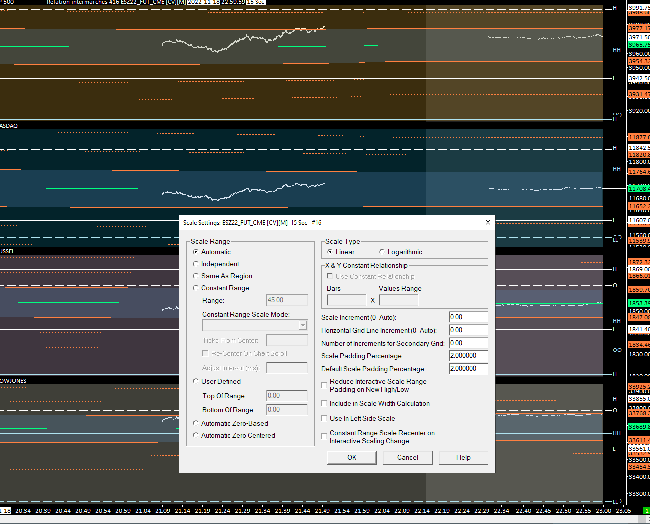 For regions 2, 3, and 4 start with the study that is giving you the "base" of what you want to display (for each region). It sounds like this is a "Study/Price Overlay" of the bar data from another symbol. For this particular study, change the scale to "Automatic". Leave the other studies in the region as "Same As Region". This should take care of it for you. For the most reliable, advanced, and zero cost futures order routing, use the Teton service: Sierra Chart Teton Futures Order Routing |
