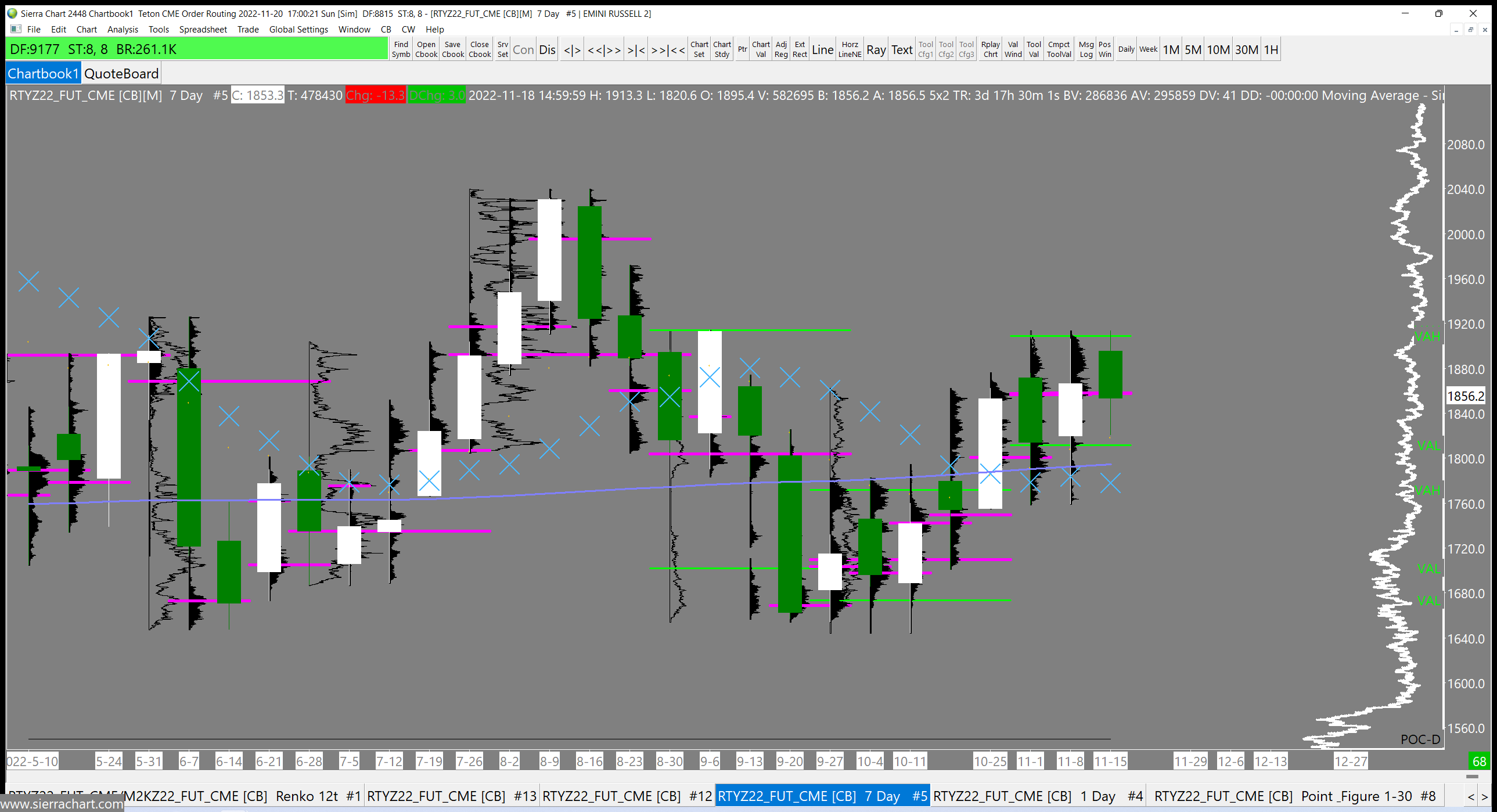 You attached the chartbook correctly - sorry we are late in responding. Do you have the option for Global Settings >> General Settings >> General >> Use Monday as Start of Week Instead of Sunday? What has us a bit confused is that in the image, the dates at the bottom are Tuesdays and not Mondays. But when we open your chart the dates are Mondays, as we would expect. We are wondering if the fact that it is Tuesday is somehow causing the issue in that the bars are not including the full week's worth of data. Please take a look at how you have your chart setup and the time zone and see if you can get the bars to show as being on Monday and then see if you have an issue with the correlation of the VbP. -- by the way, a much simpler way to do the VbP in your case, would be to set the Volume Graph Period Type to Multiple Periods Based on Bar Count and then set the Number of Bars for 'Based on Bar Count' to 1. For the most reliable, advanced, and zero cost futures order routing, use the Teton service: Sierra Chart Teton Futures Order Routing |