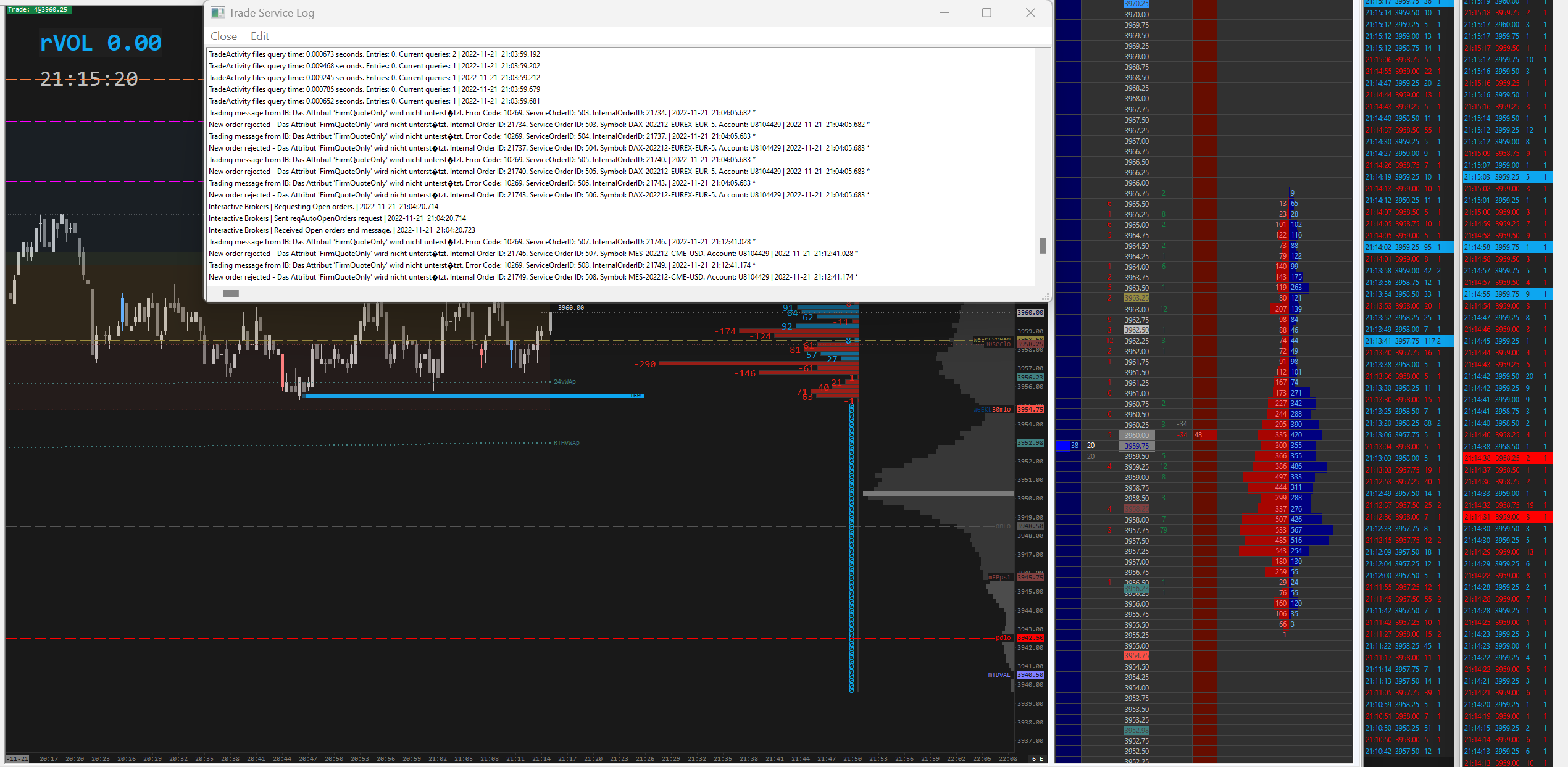 Software version: 2455 64-bit | 2022-11-23 08:20:21.121 Primary Thread ID: 9744 | 2022-11-23 08:20:21.121 Usage end date: 2023-01-23 | 2022-11-23 08:20:21.121 Enabled for: Advanced Features 2. | 2022-11-23 08:20:21.121 Enabled for: Sierra Chart Historical Data Service. | 2022-11-23 08:20:21.121 Enabled for: Denali Real-Time Exchange Data Feed. | 2022-11-23 08:20:21.121 Enabled for: Delayed Denali Exchange Data Feed. | 2022-11-23 08:20:21.121 Enabled for exchange2: CME | 2022-11-23 08:20:21.121 Enabled for exchange2: fairx_exchange.data | 2022-11-23 08:20:21.121 Allow Support for Sierra Chart Data Feeds is disabled. | 2022-11-23 08:20:21.121 Current selected Data/Trading service: Interactive Brokers | 2022-11-23 08:20:21.121 Custom symbol settings values: disabled | 2022-11-23 08:20:21.121 Chart Update Interval: 500 | 2022-11-23 08:20:21.121 Intraday Data Storage Time Unit: 0 | 2022-11-23 08:20:21.121 Time Zone: +01:00:00 (CET+01CEST+01,M3.5.0/02:00,M10.5.0/03:00) | 2022-11-23 08:20:21.121 2022-11-23 07:20:21 Local computer time in UTC | 2022-11-23 08:20:21.121 2022-11-23 08:20:21 Local computer time in SC Time Zone | 2022-11-23 08:20:21.121 2022-11-23 07:09:27 Server time in UTC | 2022-11-23 08:20:21.121 Local computer UTC time and Server UTC time difference: 1 seconds. | 2022-11-23 08:20:21.121 Program path: C:\SierraChart\ | 2022-11-23 08:20:21.121 Data Files path: C:\SierraChart\Data\ | 2022-11-23 08:20:21.121 OS Version Number: 10.0 | 2022-11-23 08:20:21.121 Locale Setting: C | 2022-11-23 08:20:21.121 DLLs: UserContributedStudies_64.dll | 2022-11-23 08:20:21.122 Allowed protected custom studies: | 2022-11-23 08:20:21.122 Crash reporter started: true | 2022-11-23 08:20:21.122 Interactive Brokers | Connecting to 127.0.0.1:7496 | 2022-11-23 08:20:25.301 IB TWS socket (1) | Creating socket. | 2022-11-23 08:20:25.302 IB TWS socket (1) | New receive buffer size: 5242880 | 2022-11-23 08:20:25.302 IB TWS socket (1) | Connecting to IP: 127.0.0.1. | 2022-11-23 08:20:25.302 Interactive Brokers | Sending API sign: API | 2022-11-23 08:20:25.809 Interactive Brokers | Sending client version: v100..136 +PACEAPI. Waiting for acceptance. | 2022-11-23 08:20:25.809 Interactive Brokers | TWS server version: 136 | 2022-11-23 08:20:25.836 Interactive Brokers | TWS time: 20221123 08:20:26 MEZ | 2022-11-23 08:20:25.836 Interactive Brokers | Connected. Sending Start API command. | 2022-11-23 08:20:26.089 Interactive Brokers | Waiting for account information. | 2022-11-23 08:20:26.089 Next valid order ID: 499 | 2022-11-23 08:20:26.107 IB Account information received. | 2022-11-23 08:20:26.107 Interactive Brokers | Received 2 Trade Accounts from TWS. | 2022-11-23 08:20:26.107 Interactive Brokers | Connected to Live account. | 2022-11-23 08:20:26.107 Updated verified funded futures trading account ending date to: 2022-12-23 07:20:26 | 2022-11-23 08:20:26.107 Interactive Brokers | Connected to server complete. | 2022-11-23 08:20:26.107 Triggering next historical data download in queue. | 2022-11-23 08:20:26.107 Triggering next historical data download in queue. | 2022-11-23 08:20:26.107 Triggering next historical data download in queue. | 2022-11-23 08:20:26.107 Triggering next historical data download in queue. | 2022-11-23 08:20:26.107 Updated verified funded futures trading account ending date to: 2022-12-23 07:20:26 | 2022-11-23 08:20:26.108 Message from IB: Die Verbindung zur Marktdatenfarm ist OK:cafarm. IB Error Code: 2104. Request ID: -1. | 2022-11-23 08:20:26.116 Message from IB: Die Verbindung zur Marktdatenfarm ist OK:eufarmnj. IB Error Code: 2104. Request ID: -1. | 2022-11-23 08:20:26.116 Message from IB: Die Verbindung zur Marktdatenfarm ist OK:cashfarm. IB Error Code: 2104. Request ID: -1. | 2022-11-23 08:20:26.116 Message from IB: Die Verbindung zur Marktdatenfarm ist OK:usfuture. IB Error Code: 2104. Request ID: -1. | 2022-11-23 08:20:26.116 Message from IB: Die Verbindung zur Marktdatenfarm ist OK:usfuture.nj. IB Error Code: 2104. Request ID: -1. | 2022-11-23 08:20:26.116 Message from IB: Die Verbindung zur Marktdatenfarm ist OK:usfarm.nj. IB Error Code: 2104. Request ID: -1. | 2022-11-23 08:20:26.116 Message from IB: Die Verbindung zur Marktdatenfarm ist OK:eufarm. IB Error Code: 2104. Request ID: -1. | 2022-11-23 08:20:26.116 Message from IB: Die Verbindung zur Marktdatenfarm ist OK:usfarm. IB Error Code: 2104. Request ID: -1. | 2022-11-23 08:20:26.116 Message from IB: Die Verbindung zur Marktdatenfarm ist OK:usopt. IB Error Code: 2104. Request ID: -1. | 2022-11-23 08:20:26.116 Message from IB: Die Verbindung zur HMDS-Datenfarm ist OK:euhmds. IB Error Code: 2106. Request ID: -1. | 2022-11-23 08:20:26.116 Message from IB: Die Verbindung zur HMDS-Datenfarm ist OK:ushmds.nj. IB Error Code: 2106. Request ID: -1. | 2022-11-23 08:20:26.116 Message from IB: Die Verbindung zur HMDS-Datenfarm ist OK:ushmds. IB Error Code: 2106. Request ID: -1. | 2022-11-23 08:20:26.116 Message from IB: Die Verbindung zur Sec-def-Datenfarm ist in Ordnung:secdefnj. IB Error Code: 2158. Request ID: -1. | 2022-11-23 08:20:26.116 No download requests in the queue to start downloads for. | 2022-11-23 08:20:26.116 No download requests in the queue to start downloads for. | 2022-11-23 08:20:26.116 No download requests in the queue to start downloads for. | 2022-11-23 08:20:26.116 No download requests in the queue to start downloads for. | 2022-11-23 08:20:26.116 Next valid order ID: 499 | 2022-11-23 08:20:26.116 Using symbol data fast lookup vector | 2022-11-23 08:20:26.117 Interactive Brokers | Starting real-time market data updates for: MES-202212-CME-USD. ID: 1 | 2022-11-23 08:20:26.117 Interactive Brokers | Subscribing to Symbol: MES, SecurityType: FUT, Expiration: 202212, Exchange: CME, Primary Exchange: , Currency: USD, Multiplier: , CallPut: , Strike: , LocalSymbol: , TradingClass: | 2022-11-23 08:20:26.117 Interactive Brokers | Requesting security definition data for: MES-202212-CME-USD. ID: 1 | 2022-11-23 08:20:26.117 