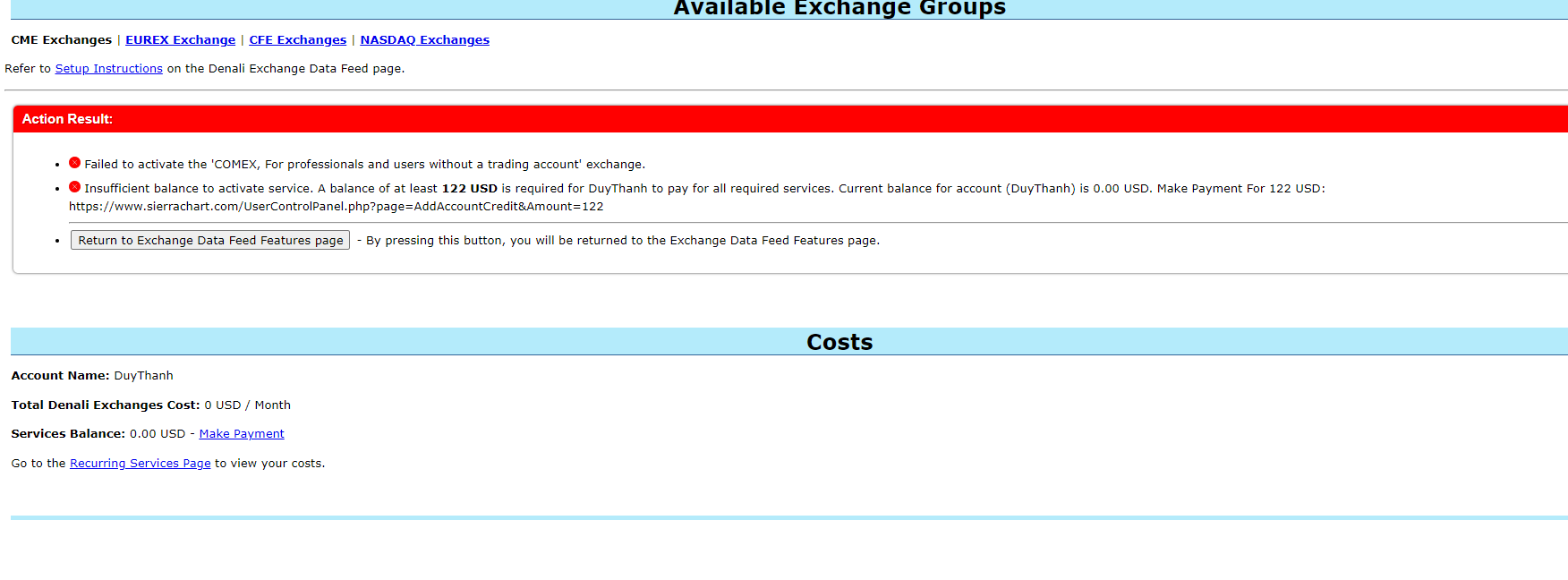 You filled out your exchange agreements to list yourself as a Professional. The Professional exchanges do not have a free trial. In order to get the one month free you need to be a non-professional. If you qualify for a non-professional (you are not listed as a Professional and you you have a live, funded, futures trading account) then you can re-submit the exchange agreements and we will change your status. For the most reliable, advanced, and zero cost futures order routing, use the Teton service: Sierra Chart Teton Futures Order Routing |