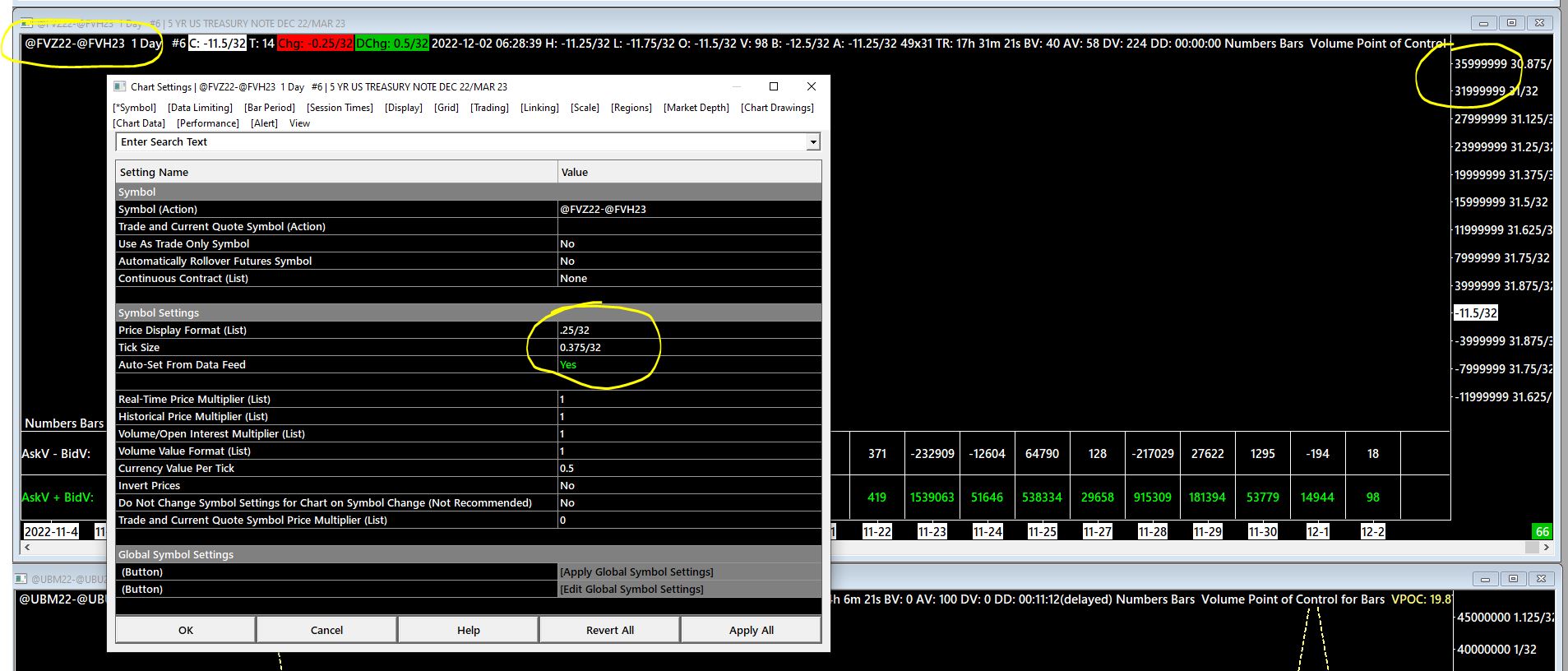 Please see the attached file regards to @FVZ22-@FVH23. I have the price display and tick size correct but the on the right scale, it displays a huge interger that should not be there. How do I resolve this?