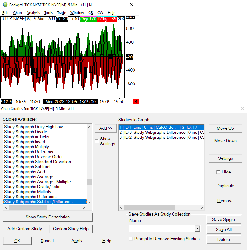 Is there a chart or study that would display an Bar-Area above or below zero based on another candle-stick-chart (like 5-minute), where the height of each bar is based on the underlying candlestick-chart's bars' Highs and Lows? i.e. with an underlying Tick chart: it would display a bar: 1) as high as the highest point of the underlying Tick bar, and 2) as low as the lowest point of the underlying Tick bar |