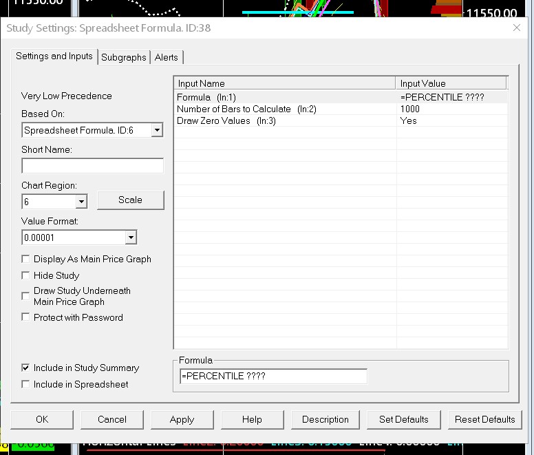 It would be the following in the Spreadsheet Study: =PERCENTILE(ID16.SG1@3:ID16.SG1@102, .9) For the most reliable, advanced, and zero cost futures order routing, use the Teton service: Sierra Chart Teton Futures Order Routing |