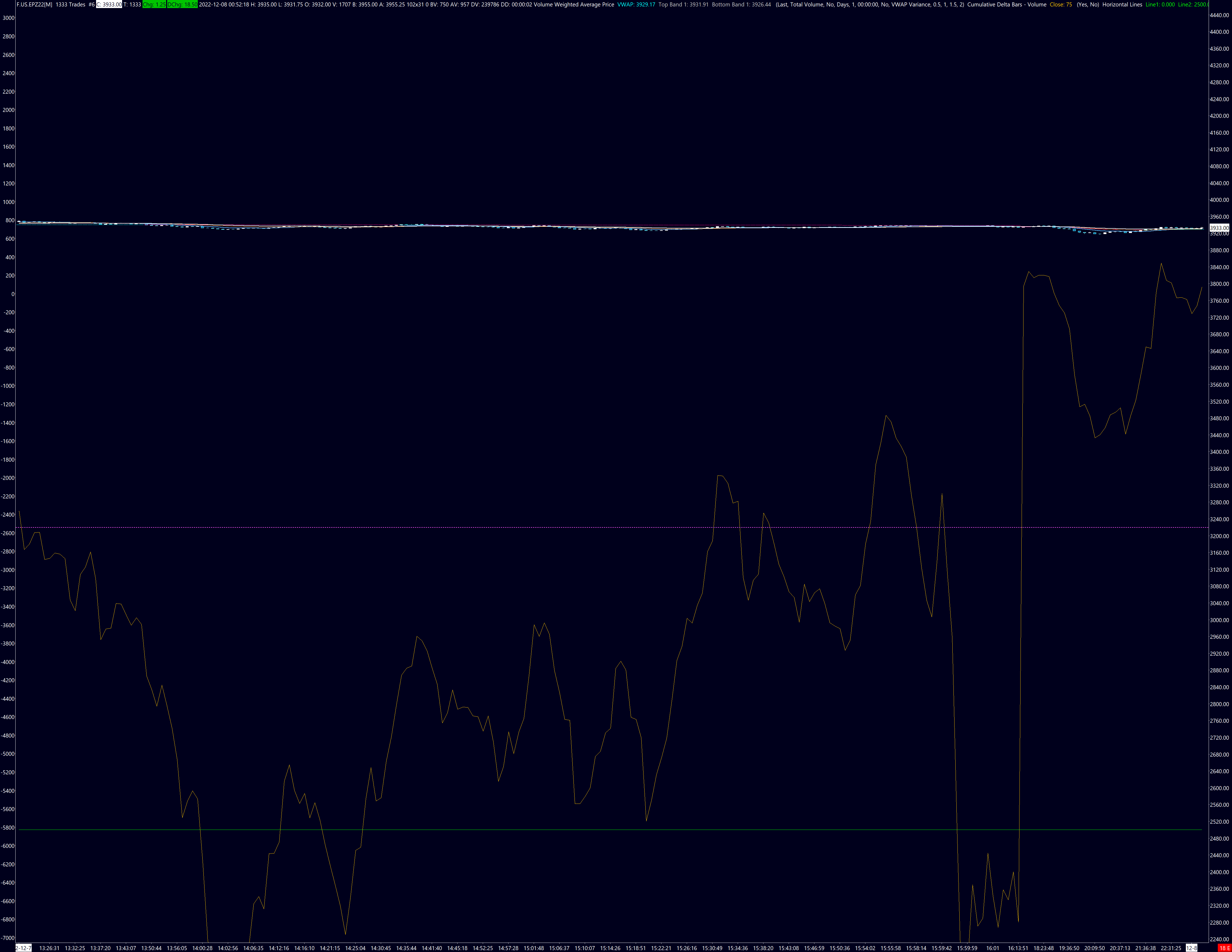 OK then it sounds like it would be best to flip the multiple items onto the right scale, and the tick chart on the left. The yellow gold line was cumulative delta which needs the horizontal lines for reference, so I'll put both of those on the right. Thank you. |