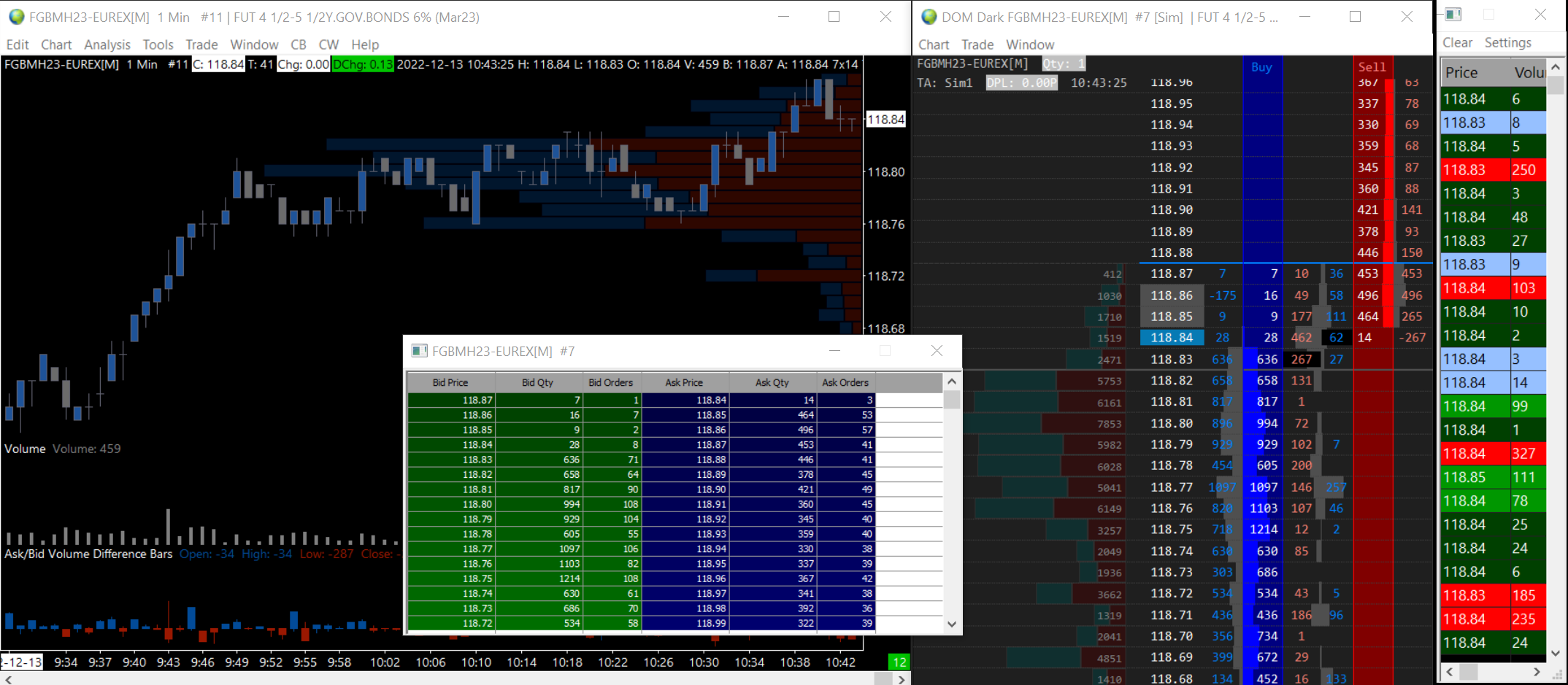 Hello! Since yesterday I have a problem in FGBMH23-EUREX (only in this symbol), the bid and ask columns in the dom are overlapping. All other symbols function normally. I hadn't changed anything and use the Denali data feed. I have already updated sierra chart, but the problem persists. I also disconnected und connected the data feed. In the attachment is a screenshot and an url is below. I've checked the Support Board, but I couldn't find a solution specific to that problem, some were similar but not the same... https://www.sierrachart.com/image.php?Image=1670933364756.png Do you know, how to fix this? |