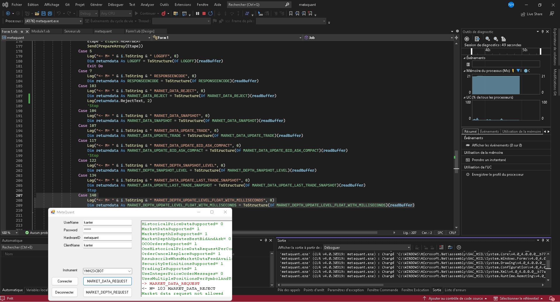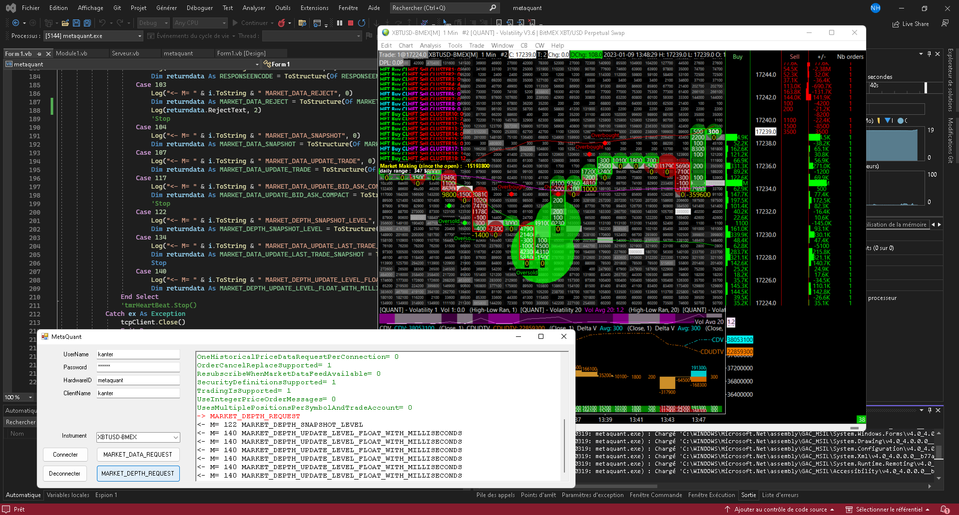 Hello dear Customer Support! my dear Forum group ! With my friend Niokoz who has been using SierraChart for more than 12 years, we decided to work with the famous DTC protocol; in order to be able to communicate with SierraChart, and thus to be able to receive market data; to feed our market visualization application: the meta_quant! Basically, for the moment, we managed to link META_quant only to crypto currency data streams like BITMEX, BITFINEX, Binance, etc! To feed our tool META_quant, we need both TRADES event (volume) and ORDERBOOK event (liquidity) data! It's been a week that I'm working on the DTC protocol, in a very intensive way, in order to be able to connect SierraChart to my stand alone exe that I just created under Visual Basic ! At the moment, I have created a small bridge (like the one of IQFEED or Rithmic) which allows me to connect to SierraChart through the DTC, to send the logon request, the heartbeat, and to receive the market data ! When I use it for a FOREX type instrument like the XAUUSD; everything works perfectly! However, as soon as I try a future instrument like the YMH23-CBOT! then I get a message from the DTC: "symbol not authorized! " However, in my Sierrachart station, and this with my small demo account "kanter"; the YMH23-CBOT works correctly! certainly in delayed 10 minutes, but I receive well the data of prices, volumes, and liquidity! I would like to know what solutions I can use to remove these restrictions from the CME groups futures markets? Do I have to take a SierraChart account in service pack 11 with the DENALI feed in real time for everything to work correctly on my side? I would really need your advice on this crucial question! Our bridge is already finished! We have tested it and it works with instruments like the XAUUSD! However, as soon as we switch to the future, we are not authorized anymore! Thanks for your quick feedback! We want to push hard and far! here is my website : https://metaquantuniverse.com Thanks Kanter and Nico |