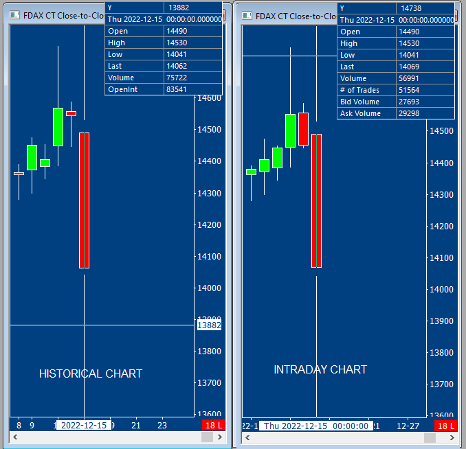I am not sure what you mean. Please find attached a screenshot of the same chart, the first is Chart Data Type: Historical Chart, the second Chart Data Type: Intraday Chart. Both are full session (i.e. the intraday chart has Session Times set from 00:00:00 to 24:59:59) As you can see in the Compact Tool Value window, the last prices are different. It is the settlement for Historical, but last for Intraday. I am not sure how I can transfer the settlement price into the intraday chart. Can you please help? Thank you. Regards, H. |