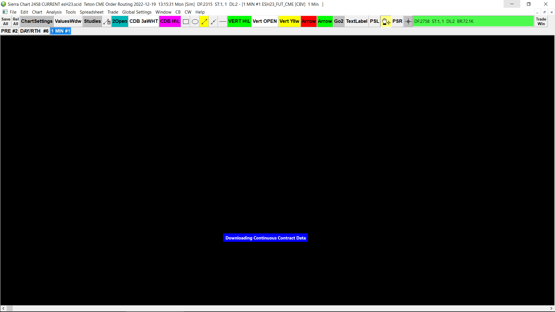 Wait. There may be a lot of data to download. For now reduce this setting: Chart Settings: Days to Load for Intraday Chart Data Type (Chart >> Chart Settings >> Data Limiting >> Load Data Limiting Method: Days to Load) Also refer to: Historical Intraday Data (Missing Data / Download Errors / Viewing More Data): Improving Historical Intraday Data Downloading Performance Sierra Chart Support - Engineering Level Your definitive source for support. Other responses are from users. Try to keep your questions brief and to the point. Be aware of support policy: https://www.sierrachart.com/index.php?l=PostingInformation.php#GeneralInformation For the most reliable, advanced, and zero cost futures order routing, *change* to the Teton service: Sierra Chart Teton Futures Order Routing Date Time Of Last Edit: 2022-12-19 20:32:03