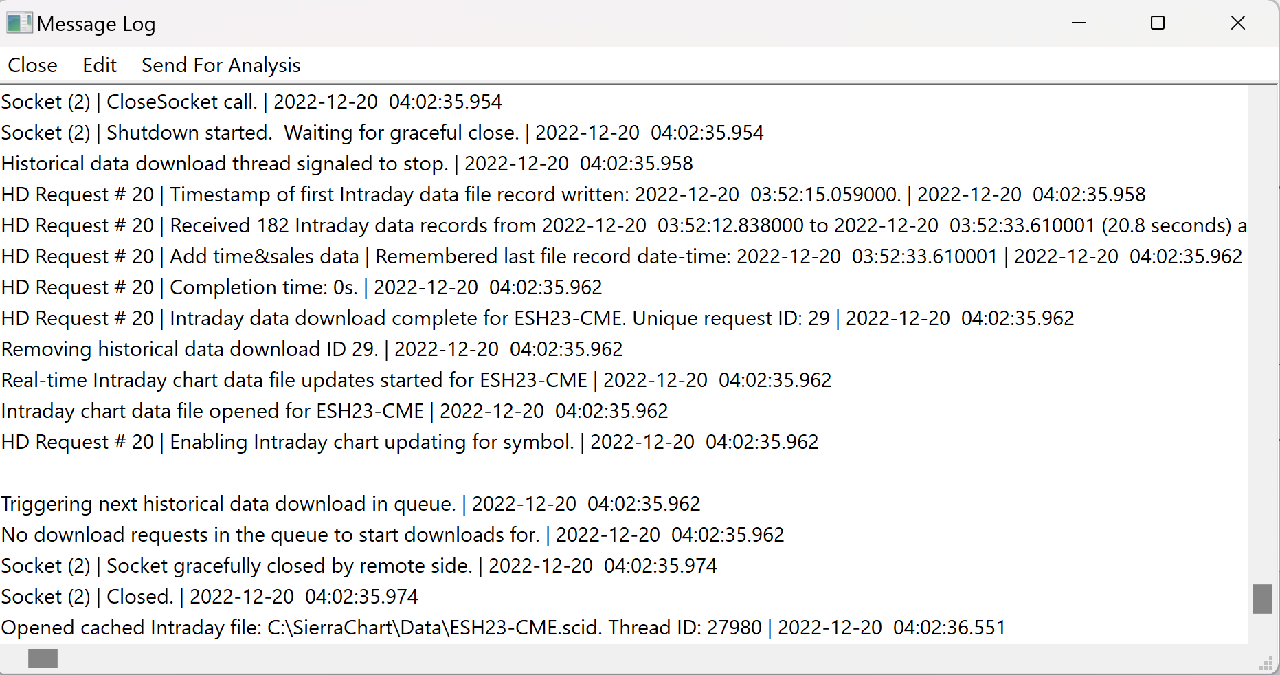 Software version: 2453 64-bit | 2022-12-20 04:02:05.497 Primary Thread ID: 13620 | 2022-12-20 04:02:05.497 Usage end date: 2022-12-27 | 2022-12-20 04:02:05.497 Enabled for: Advanced Features 2. | 2022-12-20 04:02:05.497 Enabled for: Sierra Chart Historical Data Service. | 2022-12-20 04:02:05.497 Enabled for: Sierra Chart Real-Time Exchange Data Feed. | 2022-12-20 04:02:05.497 Enabled for: Denali Real-Time Exchange Data Feed. | 2022-12-20 04:02:05.497 Enabled for: Delayed Denali Exchange Data Feed. | 2022-12-20 04:02:05.497 Enabled for exchange: U.S. Equities (NYSE, NASDAQ, AMEX) | 2022-12-20 04:02:05.497 Enabled for exchange: Euronext Equities Delayed | 2022-12-20 04:02:05.497 Enabled for exchange2: CME (Trading Account Required) | 2022-12-20 04:02:05.497 Enabled for exchange2: CBOT (Trading Account Required) | 2022-12-20 04:02:05.497 Enabled for exchange2: COMEX (Trading Account Required) | 2022-12-20 04:02:05.497 Enabled for exchange2: NYMEX (Trading Account Required) | 2022-12-20 04:02:05.497 Enabled for exchange2: fairx_exchange.data | 2022-12-20 04:02:05.497 Allow Support for Sierra Chart Data Feeds is enabled. | 2022-12-20 04:02:05.497 Current selected Data/Trading service: SC Data - All Services | 2022-12-20 04:02:05.497 Custom symbol settings values: enabled | 2022-12-20 04:02:05.497 Chart Update Interval: 500 | 2022-12-20 04:02:05.497 Intraday Data Storage Time Unit: 0 | 2022-12-20 04:02:05.497 Time Zone: +00:00:00 (UTC+00) | 2022-12-20 04:02:05.497 2022-12-20 04:02:05 Local computer time in UTC | 2022-12-20 04:02:05.497 2022-12-20 04:02:05 Local computer time in SC Time Zone | 2022-12-20 04:02:05.497 2022-12-19 22:33:55 Server time in UTC | 2022-12-20 04:02:05.497 Local computer UTC time and Server UTC time difference: 2 seconds. | 2022-12-20 04:02:05.497 Program path: C:\SierraChart\ | 2022-12-20 04:02:05.497 Data Files path: C:\SierraChart\Data\ | 2022-12-20 04:02:05.497 OS Version Number: 10.0 | 2022-12-20 04:02:05.497 Locale Setting: C | 2022-12-20 04:02:05.497 DLLs: 2022.11.2_delta_64.dll, delta_64.dll, TicinoSuite_64.dll, UserContributedStudies_64.dll, VolMultiplier_64.dll | 2022-12-20 04:02:05.497 Allowed protected custom studies: TicinoSuite | 2022-12-20 04:02:05.497 Crash reporter started: true | 2022-12-20 04:02:05.497 File >> Disconnect selected. | 2022-12-20 04:02:25.066 SC Data - All Services | Waiting for socket receive thread to end | 2022-12-20 04:02:25.068 DTC Client socket (3) | CloseSocket call. | 2022-12-20 04:02:25.068 DTC Client socket (3) | Shutdown started. Waiting for graceful close. | 2022-12-20 04:02:25.068 SC Data - All Services | Disconnected from the server. | 2022-12-20 04:02:25.068 SC DTC Delayed Exchange Data | Waiting for socket receive thread to end | 2022-12-20 04:02:25.068 DTC Client socket (1) | CloseSocket call. | 2022-12-20 04:02:25.069 SC DTC Delayed Exchange Data | Disconnected from the server. | 2022-12-20 04:02:25.069 SC Data - All Services | Disconnected. | 2022-12-20 04:02:25.069 DTC Client socket (1) | Shutdown started. Waiting for graceful close. | 2022-12-20 04:02:25.069 DTC Client socket (3) | Socket gracefully closed by remote side. | 2022-12-20 04:02:25.086 DTC Client socket (3) | Closed. | 2022-12-20 04:02:25.086 DTC Client socket (1) | Socket gracefully closed by remote side. | 2022-12-20 04:02:25.086 DTC Client socket (1) | Closed. | 2022-12-20 04:02:25.086 SC Data - All Services | Connected to server complete. | 2022-12-20 04:02:29.580 Triggering next historical data download in queue. | 2022-12-20 04:02:29.580 Triggering next historical data download in queue. | 2022-12-20 04:02:29.580 Triggering next historical data download in queue. | 2022-12-20 04:02:29.580 Triggering next historical data download in queue. | 2022-12-20 04:02:29.580 Notice: Not connected to Live trading account to receive CME realtime futures data at non-professional fees. | 2022-12-20 04:02:29.580 No download requests in the queue to start downloads for. | 2022-12-20 04:02:29.582 No download requests in the queue to start downloads for. | 2022-12-20 04:02:29.582 No download requests in the queue to start downloads for. | 2022-12-20 04:02:29.582 No download requests in the queue to start downloads for. | 2022-12-20 04:02:29.582 Mapping ESH23-CME to ESH23. Service code: cme | 2022-12-20 04:02:29.902 Using symbol data fast lookup vector | 2022-12-20 04:02:29.902 SC DTC Delayed Exchange Data | Starting real-time market data updates for: ESH23-CME (ESH23). ID: 1 Service code: cme | 2022-12-20 04:02:29.902 SC DTC Delayed Exchange Data | Connecting to the server ds23.sierracharts.com. Port 10043 | 2022-12-20 04:02:29.902 SC DTC Delayed Exchange Data | Requesting security definition data for: ESH23-CME (ESH23). ID: 1 | 2022-12-20 04:02:29.902 Added historical Intraday data request for ESH23-CME to the queue. | 2022-12-20 04:02:29.902 Intraday data recording state for symbol ESH23-CME is set to download 'Pending'. | 2022-12-20 04:02:29.902 Triggering next historical data download in queue. | 2022-12-20 04:02:29.902 Delaying start of download for ESH23-CME. | 2022-12-20 04:02:29.914 DTC Client socket (1) | Creating socket. | 2022-12-20 04:02:29.916 DTC Client socket (1) | New receive buffer size: 5242880 | 2022-12-20 04:02:29.916 DTC Client socket (1) | Connecting to IP: 142.215.17.190. | 2022-12-20 04:02:29.916 SC DTC Delayed Exchange Data | Network connection to server complete. | 2022-12-20 04:02:29.945 SC DTC Delayed Exchange Data | Starting socket receive thread. | 2022-12-20 04:02:29.945 SC DTC Delayed Exchange Data | Sending encoding request to server: Binary VLS. Compression: standard | 2022-12-20 04:02:29.945 SC Data - All Services | Starting real-time market data updates for: /ES. ID: 2 | 2022-12-20 04:02:29.998 SC Data - All Services | Subscribing to streaming market data in the service client is not supported. Symbol: /ES | 2022-12-20 04:02:29.998 SC Data - All Services | Requesting security definition data for: /ES. ID: 2 | 2022-12-20 04:02:29.998