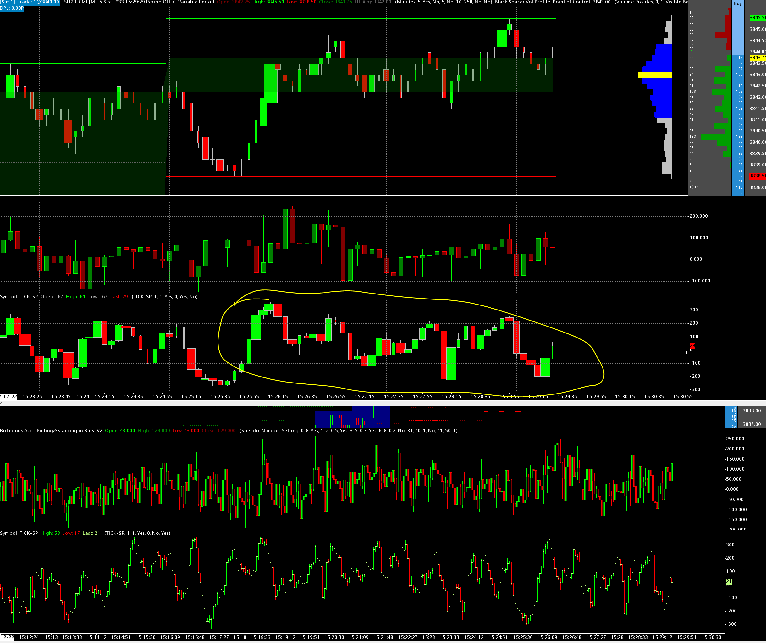 Hi, I discovered I love 5 sec bars with the "Candle Price Volume Bars" Option however when adding additional symbol your TICK-SP on the bottom it is also using equivolume bars and looks horrible. I attached a pic with same symbol on another non volume candle based chart and that's how I'd like it to be on my main 5 sec chart. Can you fix this or add an option to NOT use equivolume on bottom bars. The indicator pane above has same width bar indicator and I'd like the TICK-SP to do the same. What's worse is its constantly enlarging and shrinking and visibly next to impossible to look at! |
