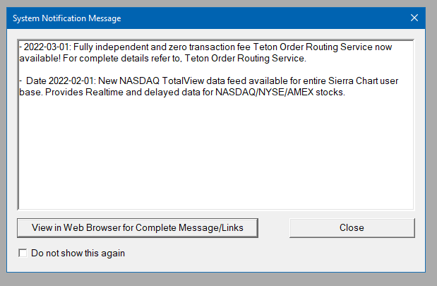 The main thing to do is to select the option at the bottom left that states "Do not show this again". Then select the Close button to close the message window. You should not get a new message window unless there is something new to show you. But, note that the image you showed has a notification of a new update to an Account Support Ticket. New posts to the Account Support Board will also cause the window to show again. For the most reliable, advanced, and zero cost futures order routing, use the Teton service: Sierra Chart Teton Futures Order Routing Date Time Of Last Edit: 2022-12-28 15:55:57