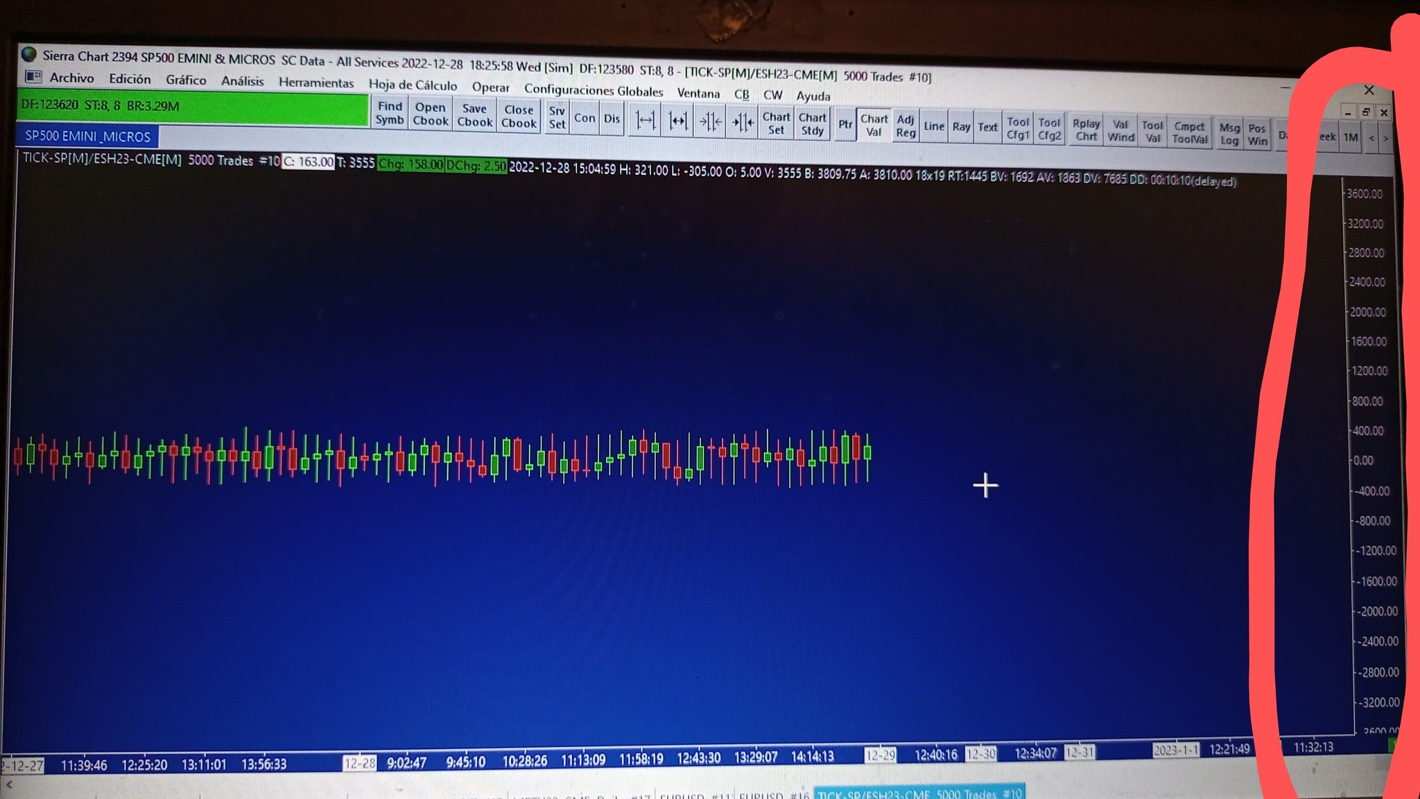 I send a screenshot where I mark the scale I am talking about with red color. Thank you You are viewing a chart for TICK-SP, which gives you "The number of stocks that traded at a higher price compared to their previous trade, minus the number of stocks that traded at a lower price compared to their previous trade." So what you are seeing on your chart is correct for that symbol. -- If you want to also see the price of the ES (we see you have ESH23-CME set as a Trade and Quote Symbol in the chart) then you would want to use the "Add Additional Symbol" study to add the ES to the same chart. If you want to put it in the same region, you can do that, but then you would want to set the Add Additional Symbol to use the Left Side Scale, and you would want to turn on the Left Side Scale. Refer to the following: Chart Settings: Use Left Side Scale (Chart >> Chart Settings >> Scale menu) For the most reliable, advanced, and zero cost futures order routing, use the Teton service: Sierra Chart Teton Futures Order Routing |