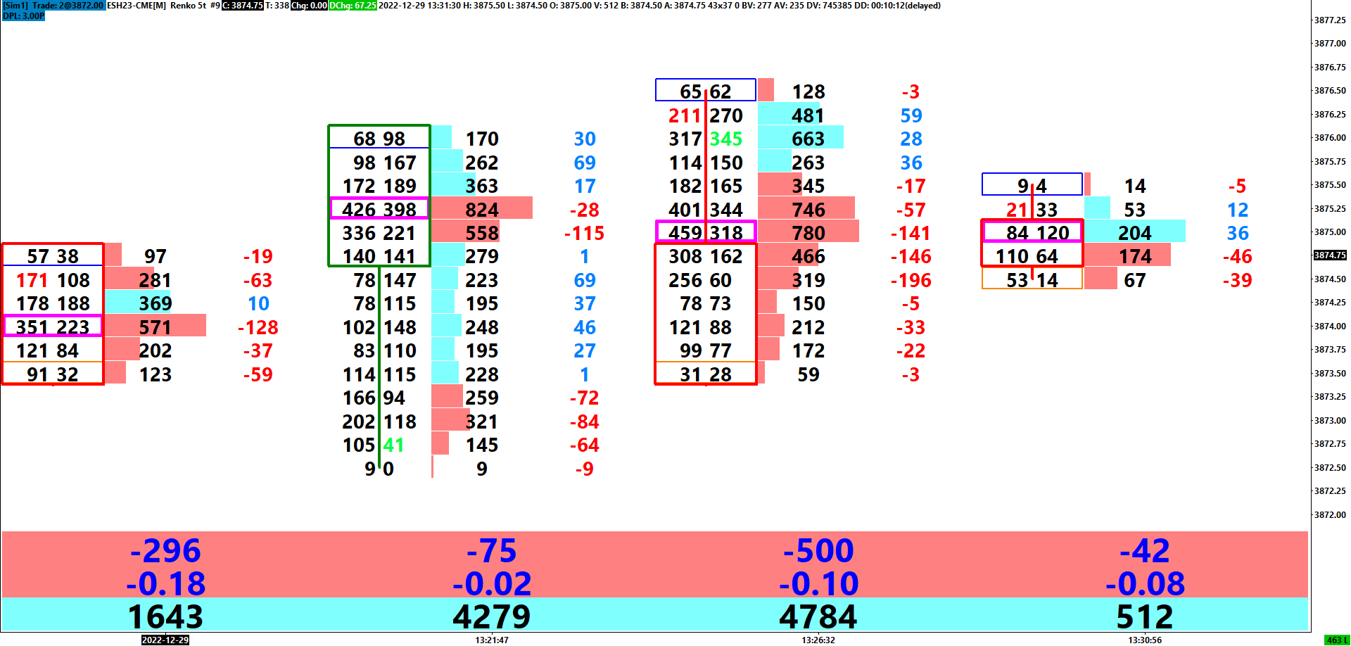 Hi SC, Not sure why the total volume traded per price is not always correct on my footprint(Please see attached image) I have the following setting:- Column 2 Numbers Bar Text : Volume Column 2 Background Type: Volume Profile Column 2 Background Coloring Method Type: Based On Dominant AskVolBidVol - Actual Column 2 Text Coloring Method: None E.g., 65 bid Vol + 62 ask vol = 127 not 128, 68 bid vol + 98 ask vol = 166 not 170, 99 bid vol + 77 ask vol = 176 not 172. Not sure why this is. Kind Regards Stephen |