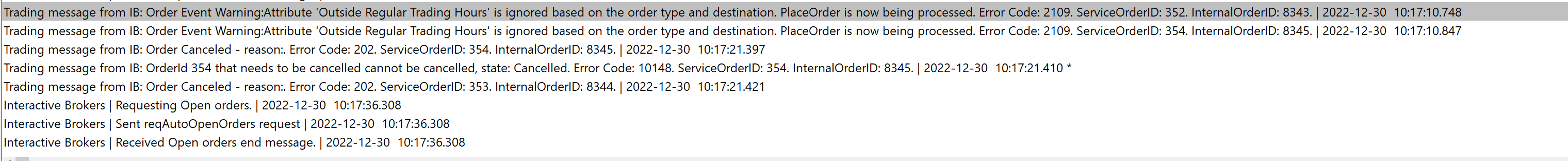 I think I kind of found something, "Cancel Orders on Flat Position" was enabled for me. I just realized that after 8 seconds an order is executed, the position line disappears for some reason (I don't use SMART routing so I expect not to see some weird IB-SC order issues) and probably quantity also went to 0 again and SC cancels the order by thinking the position is flattened. Do you think why position line disappears (I read Interactive Brokers Trading Service: Trade Position Line or Quantity Disappearing or Displaying Zero)? Here is Trade positions window for the specified trade. Right after the order is executed there is only 1 record and symbol is TSLA-STK-ARCA-USD, couple of seconds later, the trade disappears and another one with the same trade data but "TSLA" symbol is added. I think that's the reason explained at Interactive Brokers Trading Service: Trade Position Line or Quantity Disappearing or Displaying Zero but I don't get why I am having it now, last week everything was ok with the same configs. May IB have changed something ? Date Time Of Last Edit: 2022-12-30 18:43:42