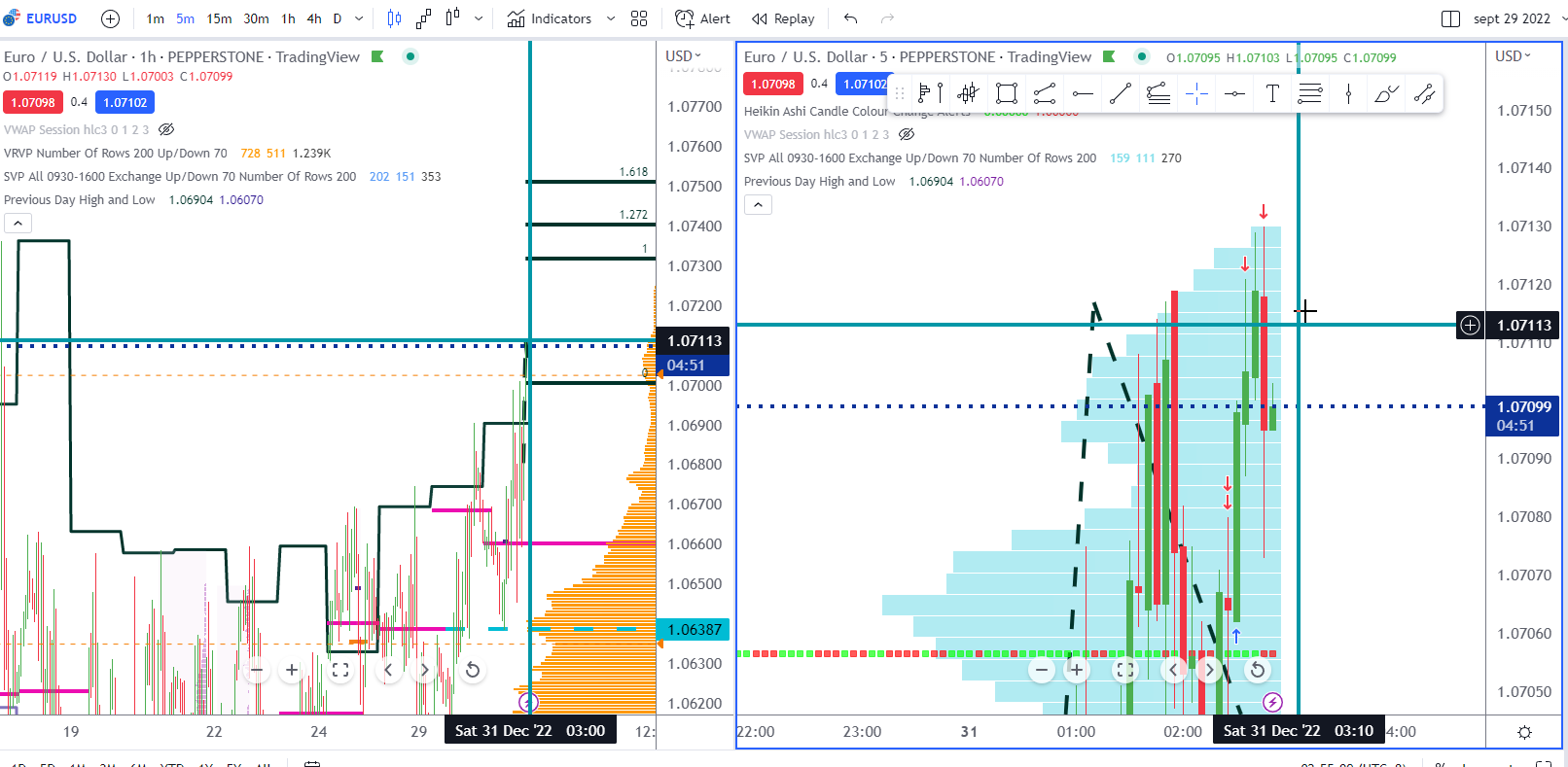 Hi, please advise how to link the crosshair of two different time frame windows . I want the effect as the below photo ( the price both point to 1.07113 and time both point to 3:00 and 3 :10 Thanks |