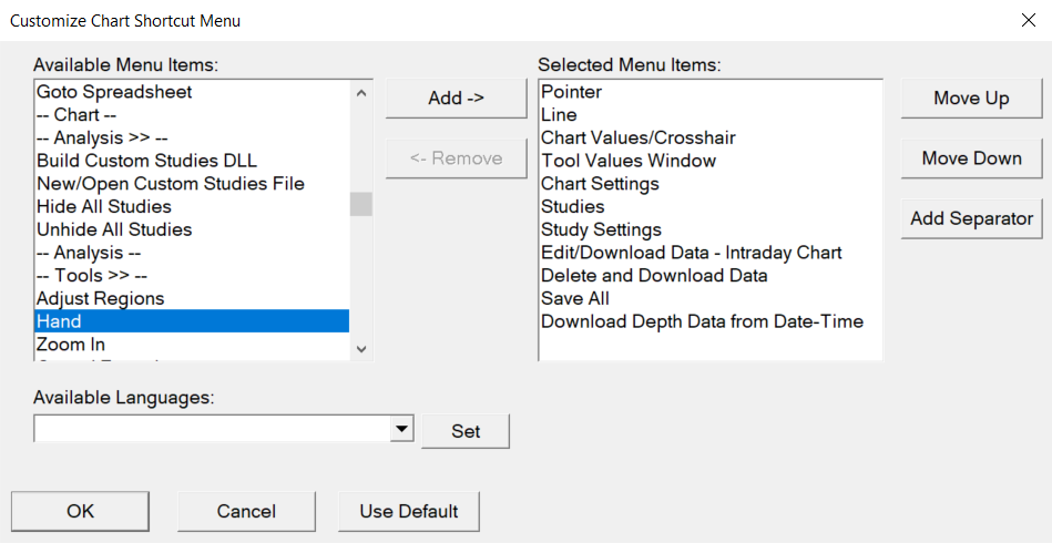 Select Global Settings >> Customize Chart Shortcut Menu. Refer to the attached image for the location of the Hand tool within the list of options. Select it, then select the Add button to move it to the right. Select it on the right and use the Move Up/Move Down to change the location in the list. For the most reliable, advanced, and zero cost futures order routing, use the Teton service: Sierra Chart Teton Futures Order Routing |