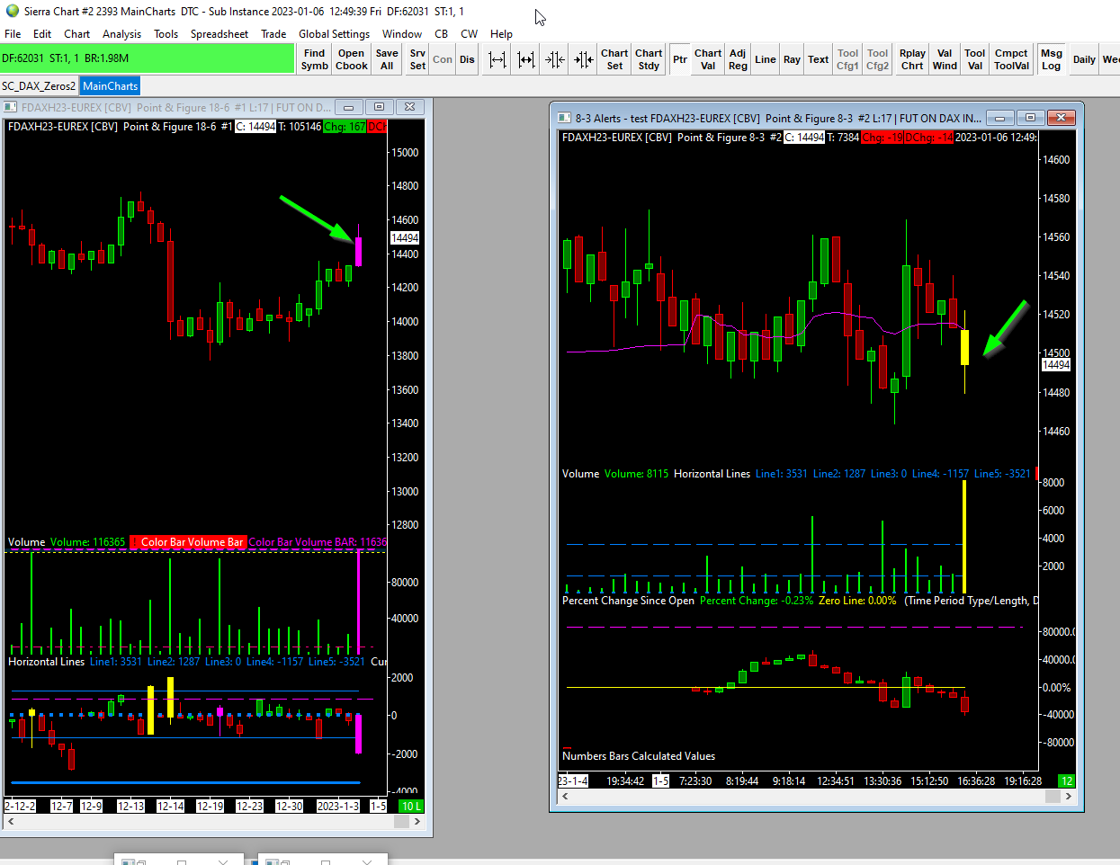 We do not understand what the issue is. You are comparing an 18-6 Point and Figure to an 8-3 Point and Figure. These are going to give you two different charts, which is what you have. We see that you point out the bars that appear to have an alert on them. Is this the question? Is there some question about the alert? For the most reliable, advanced, and zero cost futures order routing, use the Teton service: Sierra Chart Teton Futures Order Routing |