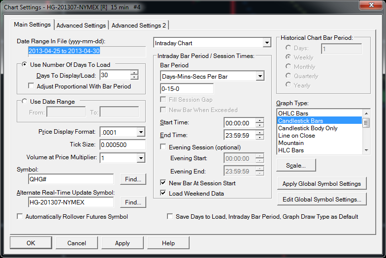 You need to make this change within the copy connected to the iQFeed. Follow through the instructions in help topic 42.1 here: http://www.sierrachart.com/index.php?l=doc/helpdetails42.html#h42.1 Although, when it comes to modifying the Chart >> Chart Settings, you need to do this in the copy connected to Interactive Brokers. Also be aware of the information in this section: http://www.sierrachart.com/index.php?l=doc/DTNIQFeed.html#TickLimitMarketHours Sierra Chart Support - Engineering Level Your definitive source for support. Other responses are from users. Try to keep your questions brief and to the point. Be aware of support policy: https://www.sierrachart.com/index.php?l=PostingInformation.php#GeneralInformation For the most reliable, advanced, and zero cost futures order routing, *change* to the Teton service: Sierra Chart Teton Futures Order Routing Date Time Of Last Edit: 2013-05-01 19:37:39
